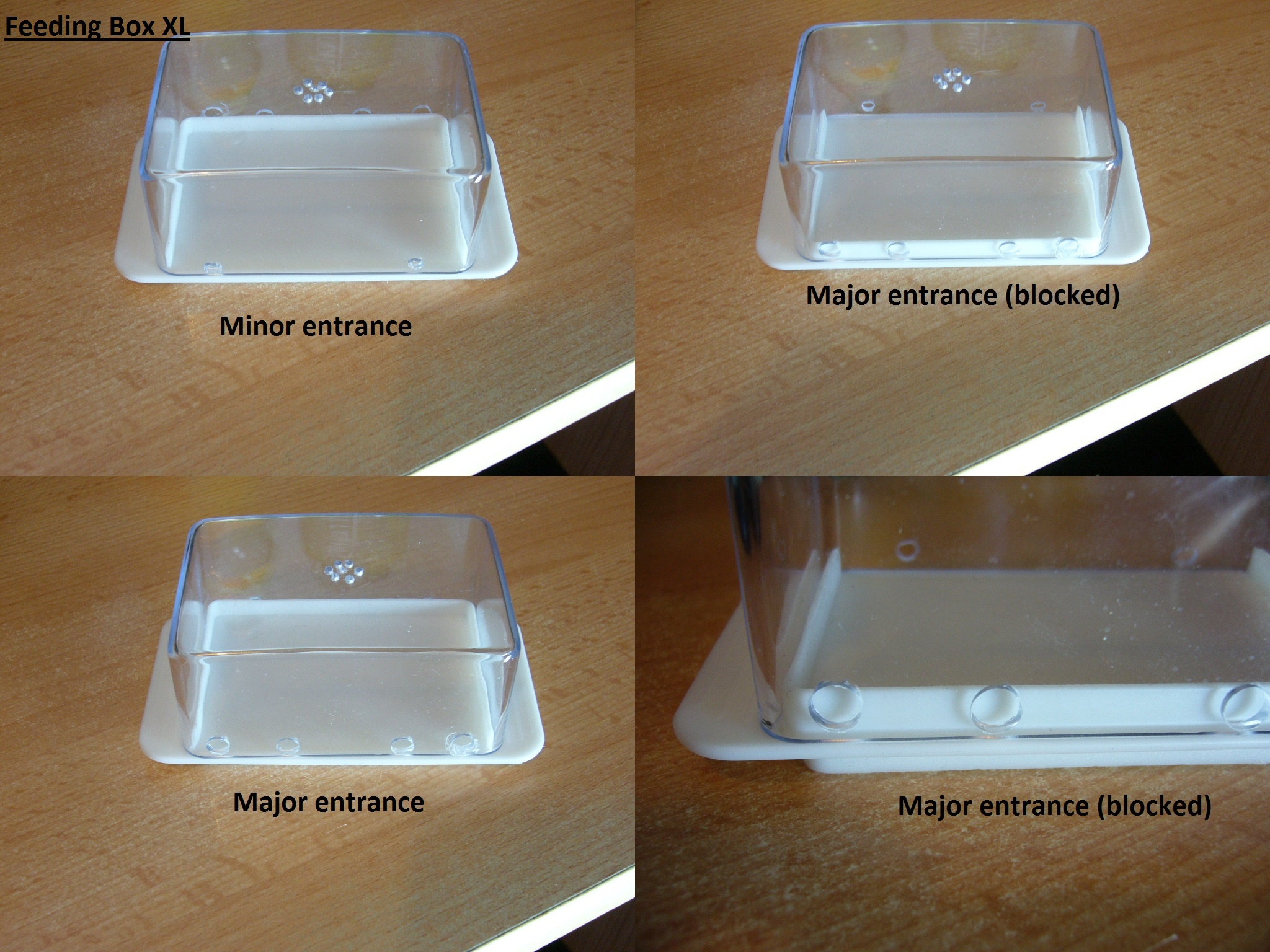 Von Fütterung im Reagenzglas ist generell abzuraten - einige der Arbeiterinnen können extrem aggressiv werden und versehentlich aus dem Reagenzglas rennen und verlorengehen. Sobald erste Arbeiterinnen vorhanden sind sollte das Regenzglas in ein Becken gelegt und das Futter dort angeboten werden.