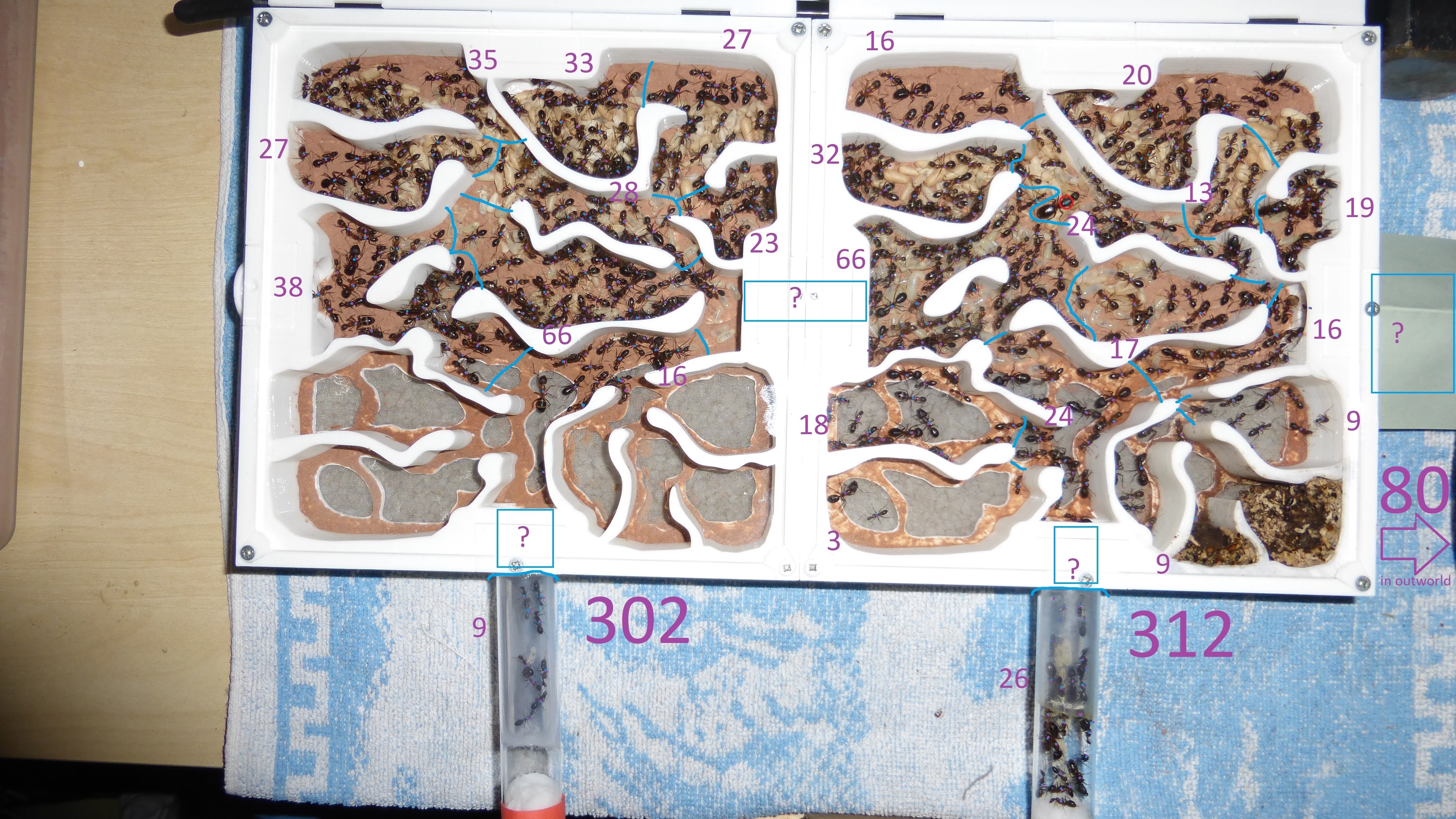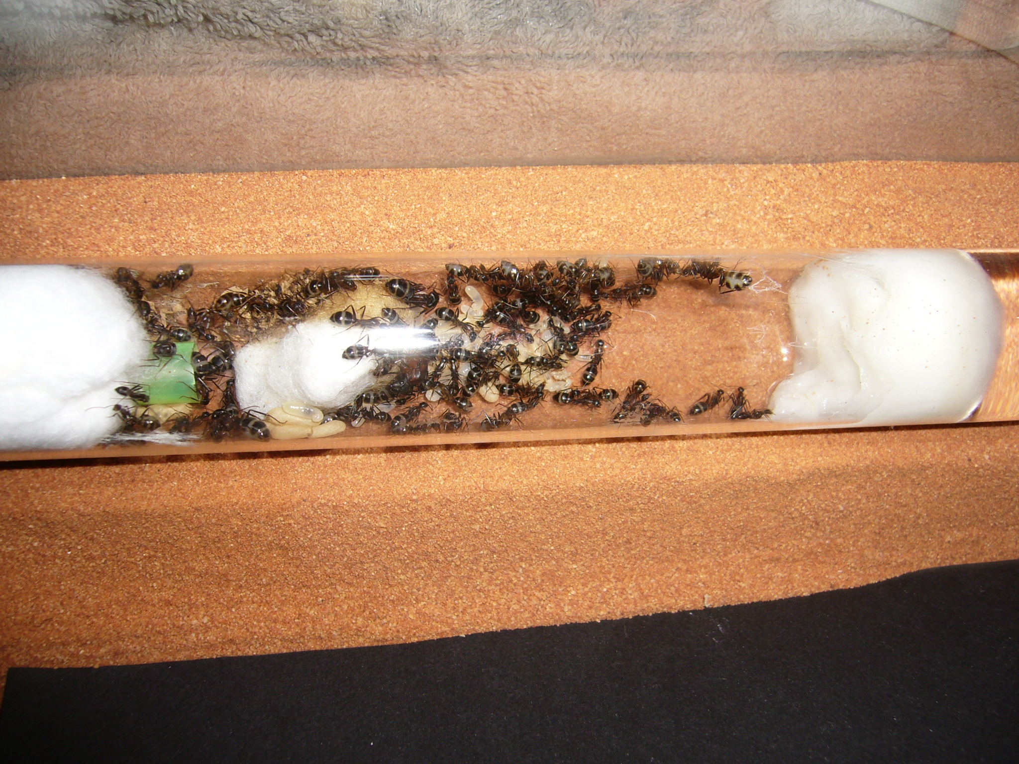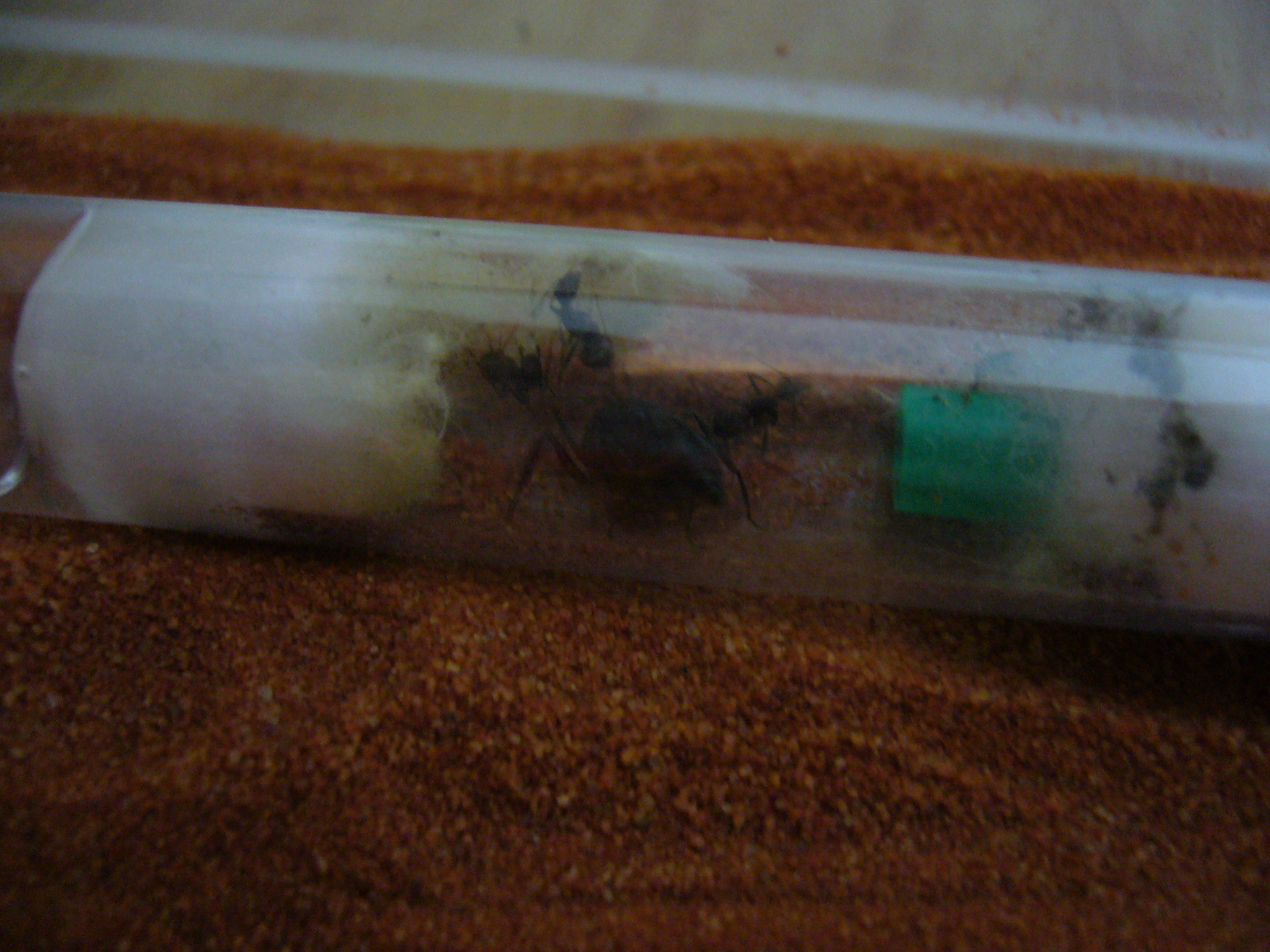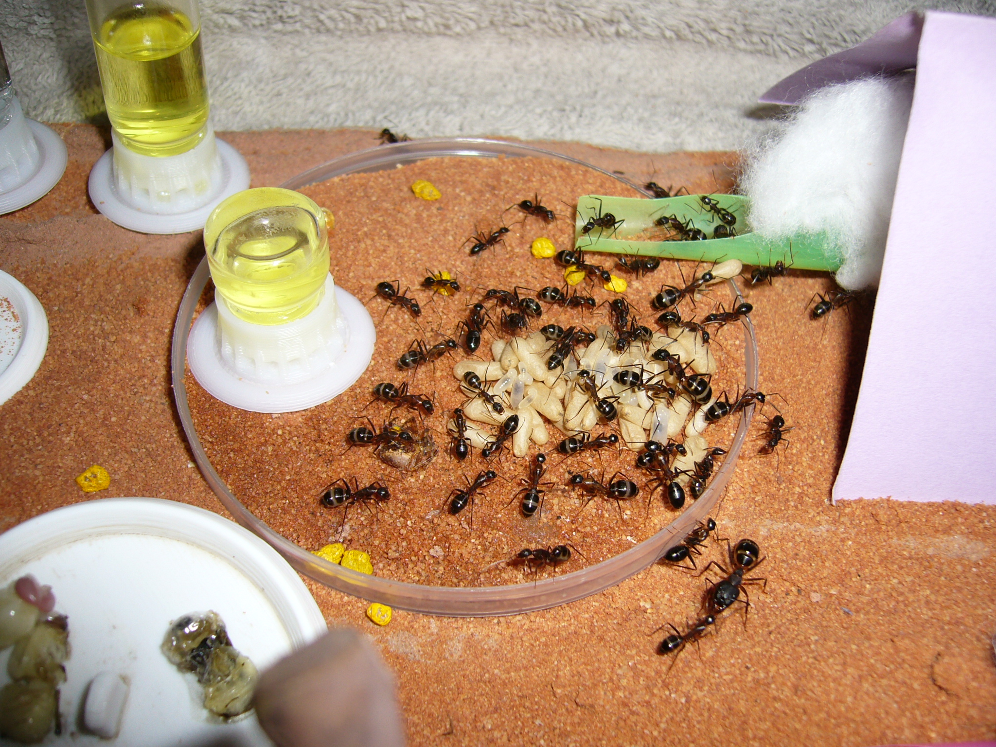 Ganz offensichtlich handelt es sich hier um nachtaktive Ameisen. Solange die Kolonie noch klein ist (weniger als 1000 Arbeiterinnen) sieht man sie tagsüber nur sehr selten draußen, wenn man ihre Arena nicht gerade mit einem Tuch abdeckt - kommt man damit nicht zurecht, sollte man sich lieber eine andere Ameisenart aussuchen.
