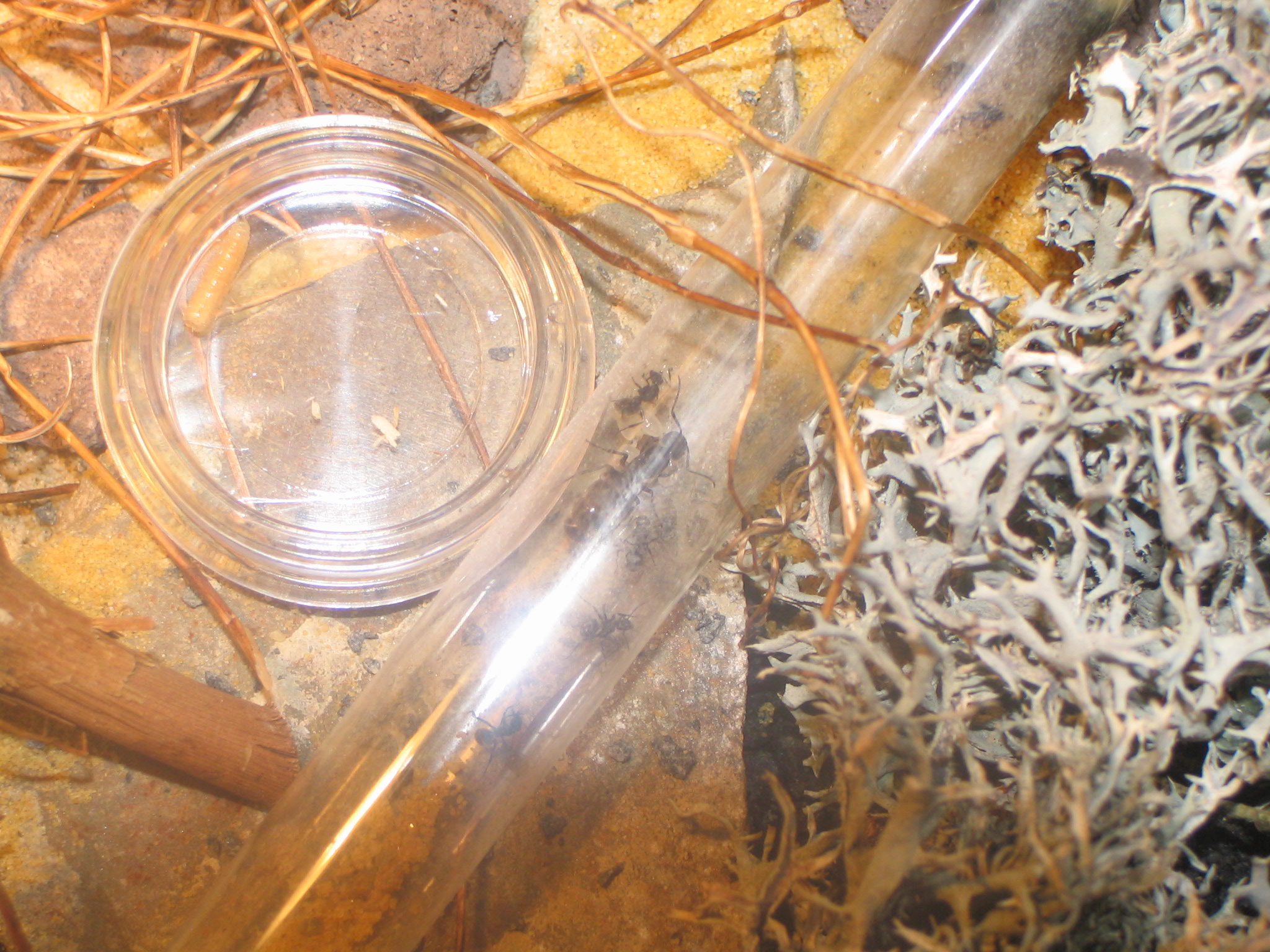 Heute morgen hab ich zufällig eine der Arbeiterinnen beim Spaziergang durch das Formicarium entdeckt! Hab ihr dann mal ein kleines Heimchen in Ameisengerechte größe geschnitten und mit einem Zahnstocher angeboten! Und sie hat es tatsächlich von dem Zahnstocher genommen und ins Nest getragen :-)