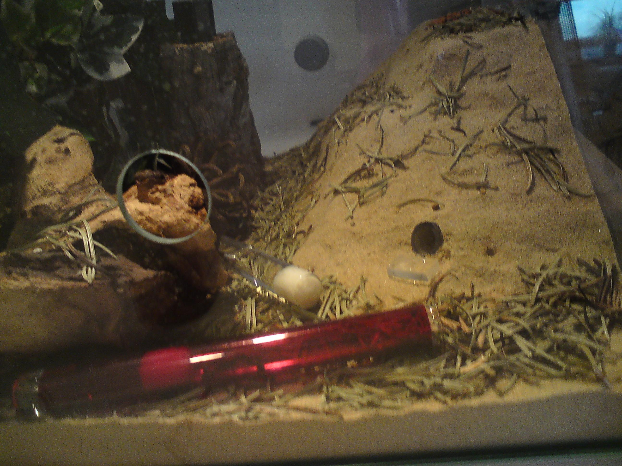 [font=Calibri]Seit einer Woche wird der vordere Teil des RG´s tägl. Für ca. 8 Stunden mit einer 15W Lampe erwärmt. Schon kurze Zeit nachdem sich die Lampe einschaltet, bewegt die gesamte Kolonie in das vordere Warme Ende, Richtung Eingang. Ohne Lampe beträgt die Temperatur 20°C, mit Lampe knapp 24°C, wobei ich davon ausgehe das die Temperatur am bzw. im RG etwas höher sein dürfte. LF außerhalb des liegt zwischen 60% und 65%. Einzige Erklärung wäre ein zu trockenes RG, der Wassertank ist zwar noch komplett voll, aber genau da könnte das Problem liegen, evtl. habe ich die Watte zu fest gestopft und es kommt keine Feuchtigkeit im RG an. Allerdings biete ich zusätzlich Wasser an.[/font]