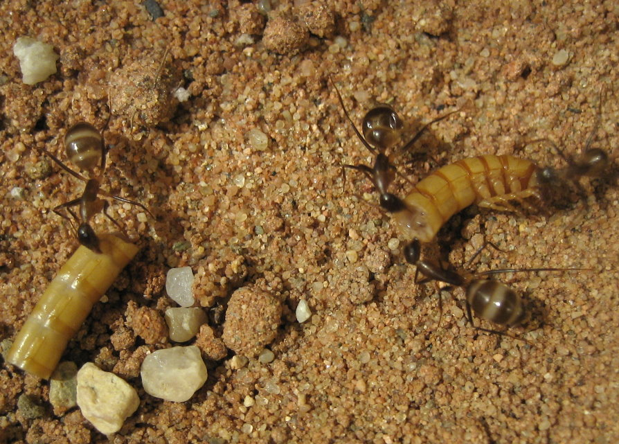 - Beobachtung: Nachdem zwei Mehlwurm-Hälften vor dem Nest angeboten wurden, löst eine Arbeiterin einen winzigen Happen aus dem Futtertier und bringt ihn auf direktem Wege zu einer Larve, auf welcher das Futter auch sofort serviert wird. Schlussfolgerung: Futter muss nicht immer erst über Nestgenossinnen weitergereicht werden.