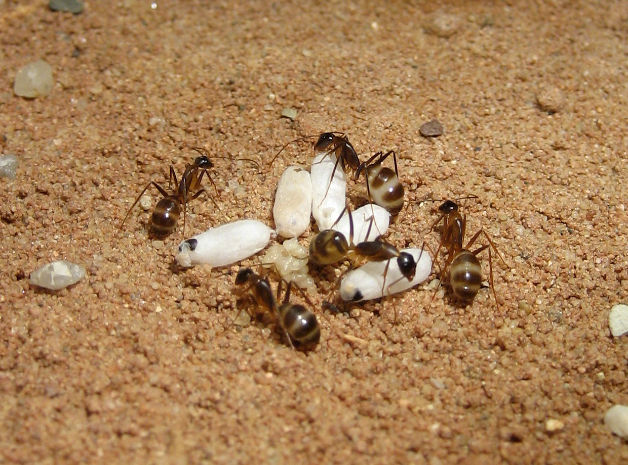 - Arttypisch: Ich durfte das erste Sonnenbad bei Camponotus (in diesem Fall C. fellah) beobachten (8). Die Temperatur belief sich punktuell auf 26 °C, bei 22 °C Zimmertemperatur. Nach einiger Zeit wurde der Eierhaufen aber wieder ins Nest gebracht, die Puppen blieben. Die Arbeiterinnen verhielten sich ruhig und ließen sich durch meine Gafferei und Knipserei nicht verunsichern. Selbst nachdem eine Arbeiterin kurzzeitig verrückt spielte, blieben die Puppen vor Ort. Keine zehn Minuten nach Ausschalten der Lampe war alles wieder im Nest verstaut. Obwohl sich an der Lampenposition nichts geändert hat, war das Sonnenbad bisher eine einmalige Beobachtung.