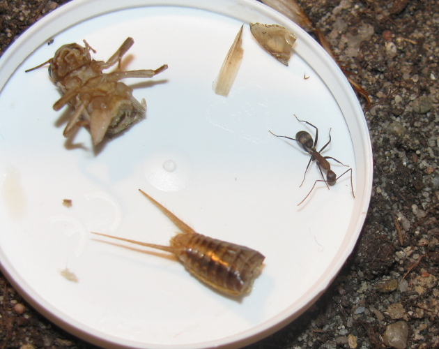Jedes Futtertier, egal ob Fliege (Absolute Leibspeise der Kolonie!), Heimchen, Heuschrecke, Schabe oder Made, alles wird erst einmal in die obere Kammer gebracht und dort von den Arbeiterinnen auseinander genommen. Später wird die Beute dann hinunter zu den Larven gebracht.