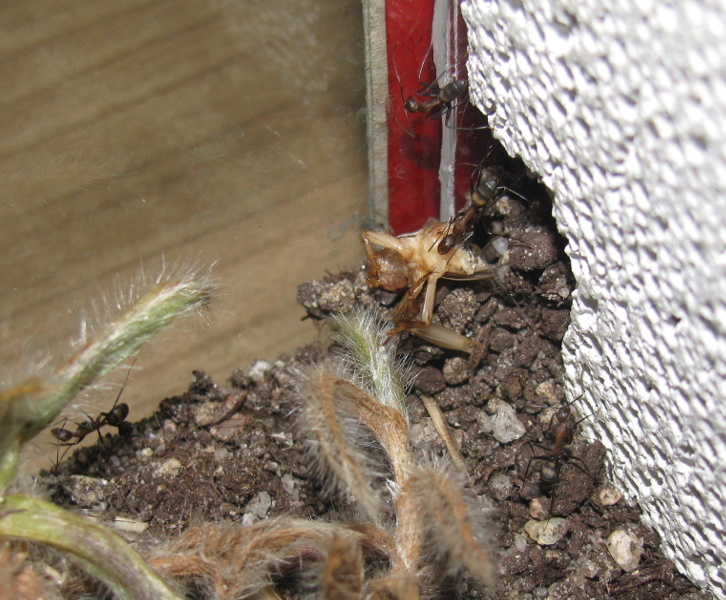 Und da sind die Arbeiterinnen wirklich zuverlässig, wie oben schon geschrieben. Kaum liegt eine Fliege oder ein Heimchen im Napf, dauert es keine 5 Minuten und die erste Arbeiterin hat es gefunden.