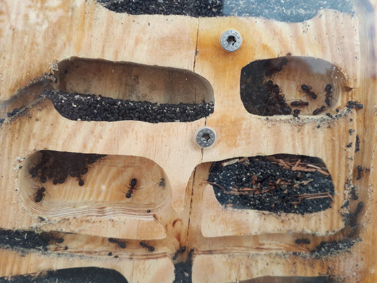 Nun steht die komplette Arena mit bei den Camponotus. Beide Völker sind stark und stabil genug um es zu testen. Begegnungen konnte ich noch nicht beobachten, aber offensichtlich bekommen die Temnothorax auch was von den Proteinen ab. Deren sandige Arena bleibt bestehen, da ich das Kiefernest über den Sand befeuchte und die Camponotus staubtrocken auf Waldboden leben. Außerdem kann ich so das komplette Gebilde einfach wieder entfernen, sollte es dennoch zu Problemen kommen.