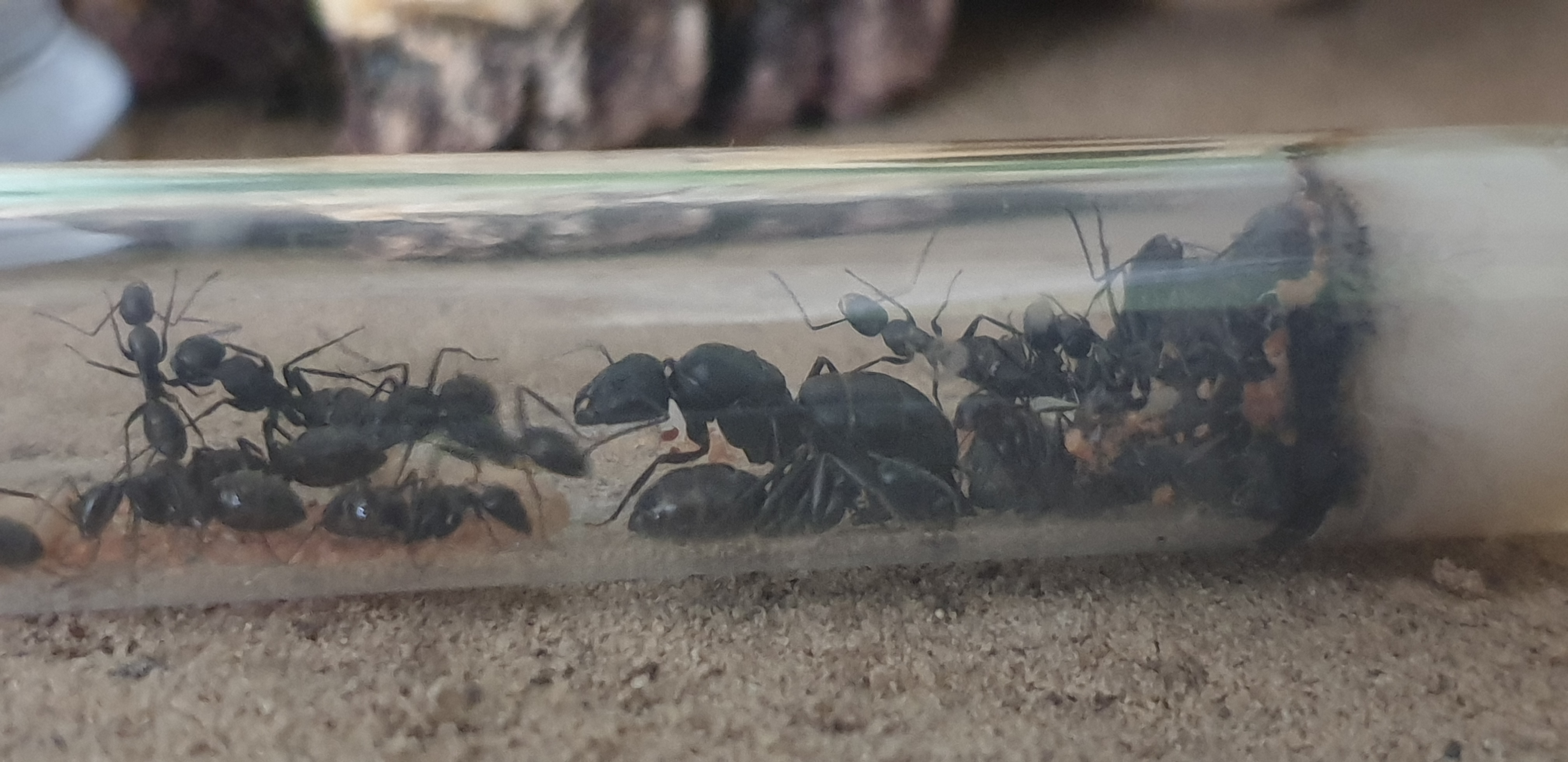 Heute Morgen beim kurzen Check sah ich, dass das Honigwasser weniger geworden ist und... sie mit dem gesamten losen Sand das Reagenzglas komplett verbarrikadiert haben