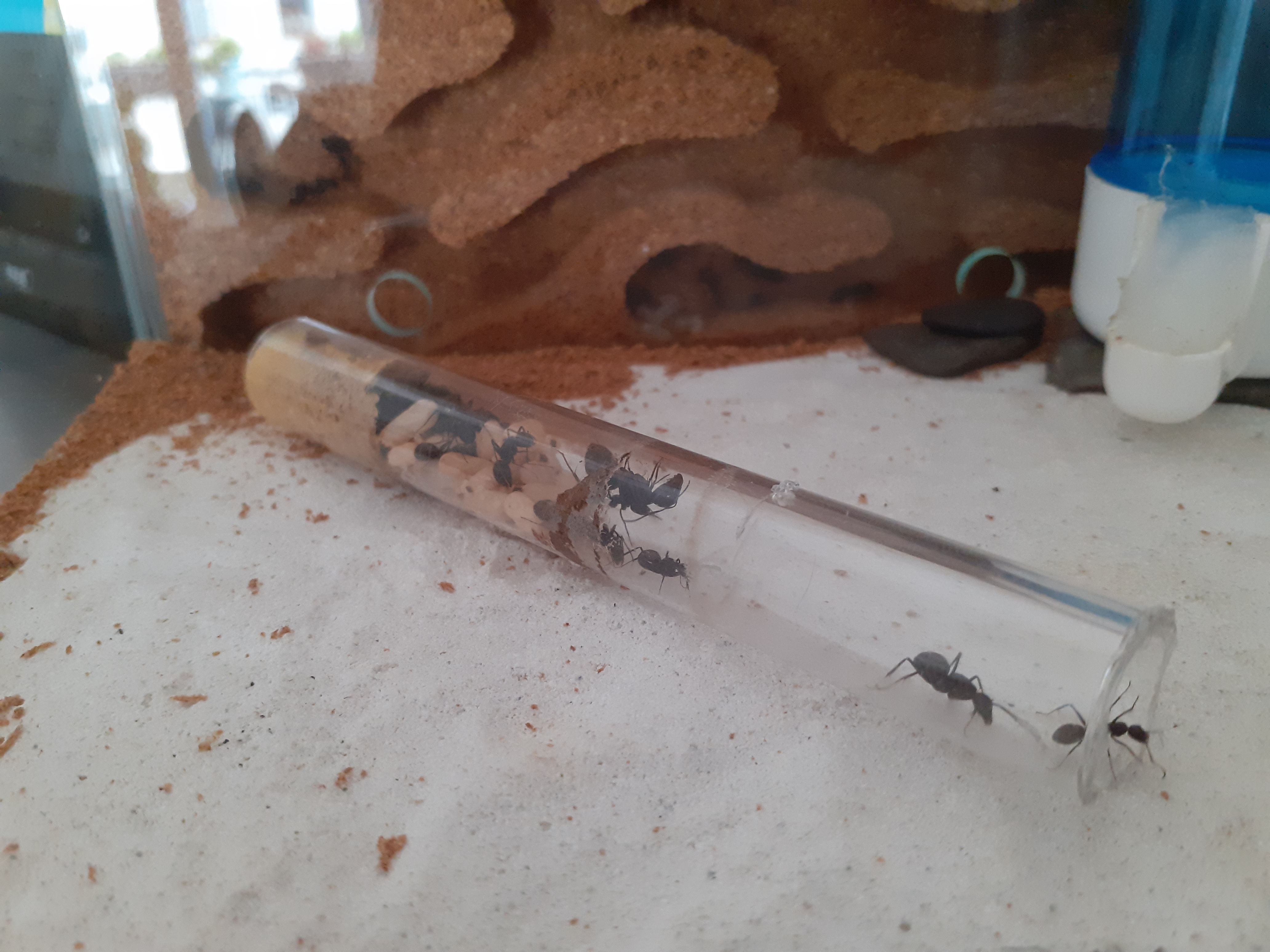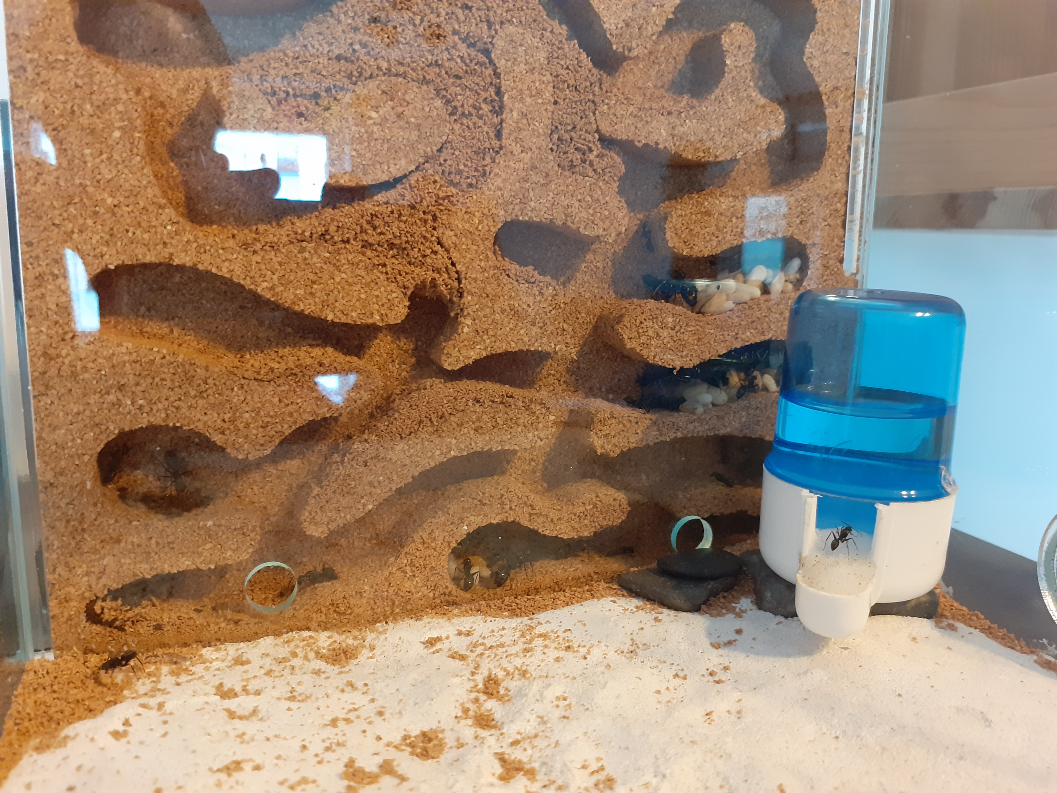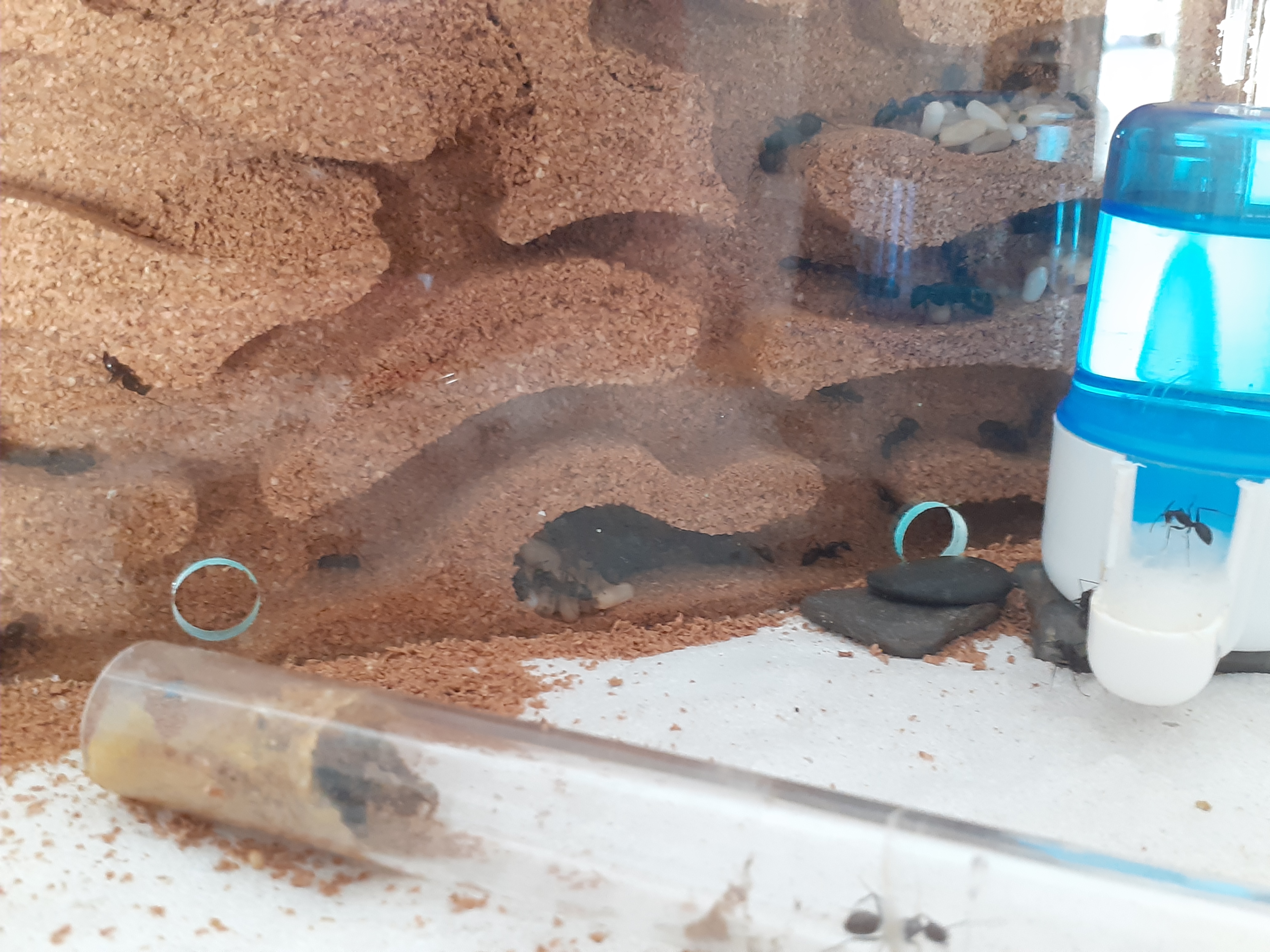 der Umzug ist abgeschlossen und meine Ameisen bewohnen aktiv ihr neues zu Hause. Gelegentlich stoßen sie auf noch mit Korkmehl blockierte Bereiche und "graben" dort etwas. Seit sie nicht mehr im Neströhrchen sind, sieht man sie auch häufiger an der Wassertränke. Leider hatte ich auch schon wieder zwei Verluste. Sie zählten beide zu den kleinsten Ameisen und ich gehe daher davon aus, dass es sich um Pygmäen handelte. Damit wären sie etwa jeweils ein Jahr alt geworden...