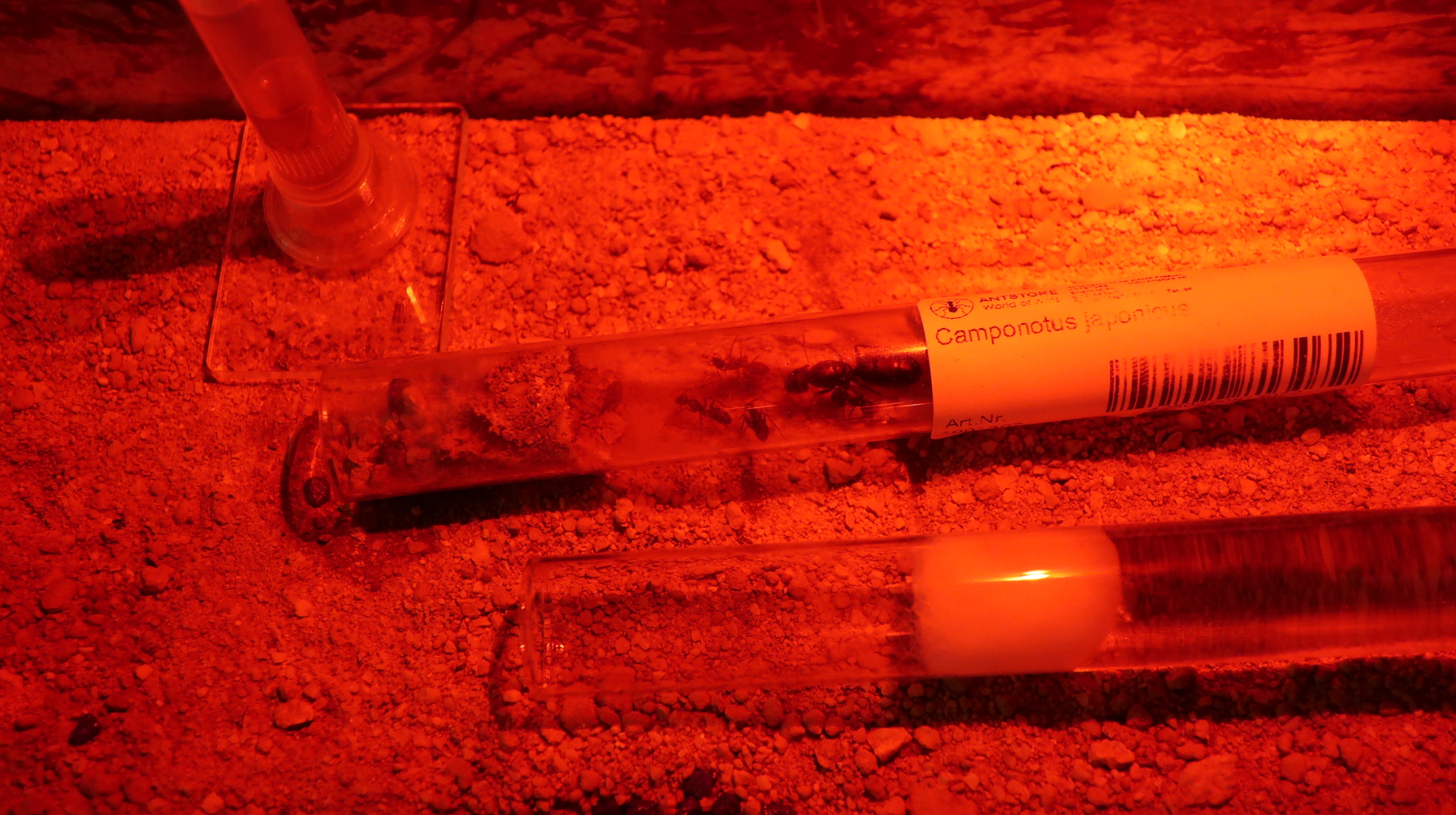 Aber zum Thema Vibrationen. Mir ist aufgefallen, dass Ameisen lichtempfindlich sind. Das hat sich sicherlich schon rumgesprochen. Genauer gesagt bin ich des Glaubens, Ameisen würden lediglich auf Lichtwechsel reagieren. Noch genauer auf plötzliches Hellerwerden. Gegen den Lichtschreck beim Reinschauen ins Reagenzglas kann man also vorbeugen, indem man seine Kolonie langsam an Umgebungslicht gewöhnt und nur vor direktem Sonnenlicht und direkter Zimmerbeleuchtung abgeschirmt. Ich nutze dafür ein Stück Rinde.