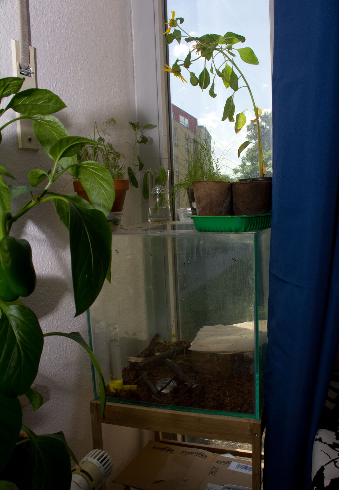 Das Nest steht ja in der Ecke zwischen zwei Fenstern bei meinen ganzen Pflanzen. Leider etwas schlecht zugĂ€nglich aber leider hab ich keinen besseres Platz zurzeit. Vielleicht Ă€ndert sich das in den nĂ€chsten Monaten, wenn ich eine grĂ¶ĂŸere Wohnung finde. Dann gibt es auch ein grĂ¶ĂŸeres Becken und Nest.