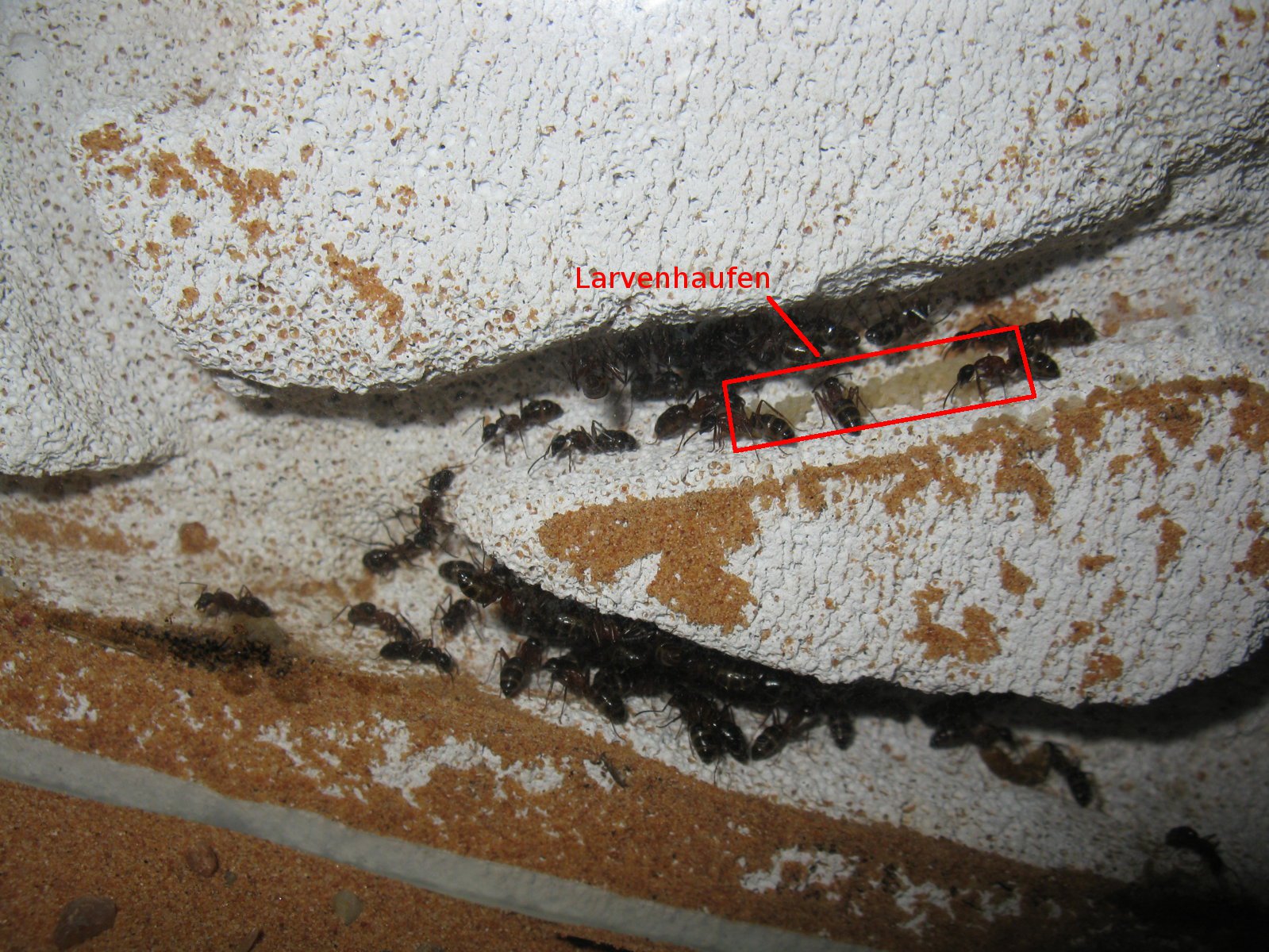 Zum Schluss noch ein Wort zur Nestfeuchte: Ich habe nun seit langer Zeit das Nest nicht mehr befeuchtet. Die Tiere scheinen nichts dagegen zu haben. Ich werde deswegen das Nest gar nicht mehr befeuchten, und zwar so lange, bis ich ein Unwohlsein der Ameisen bemerke. Wasser in der Arena ist natürlich immer vorhanden.