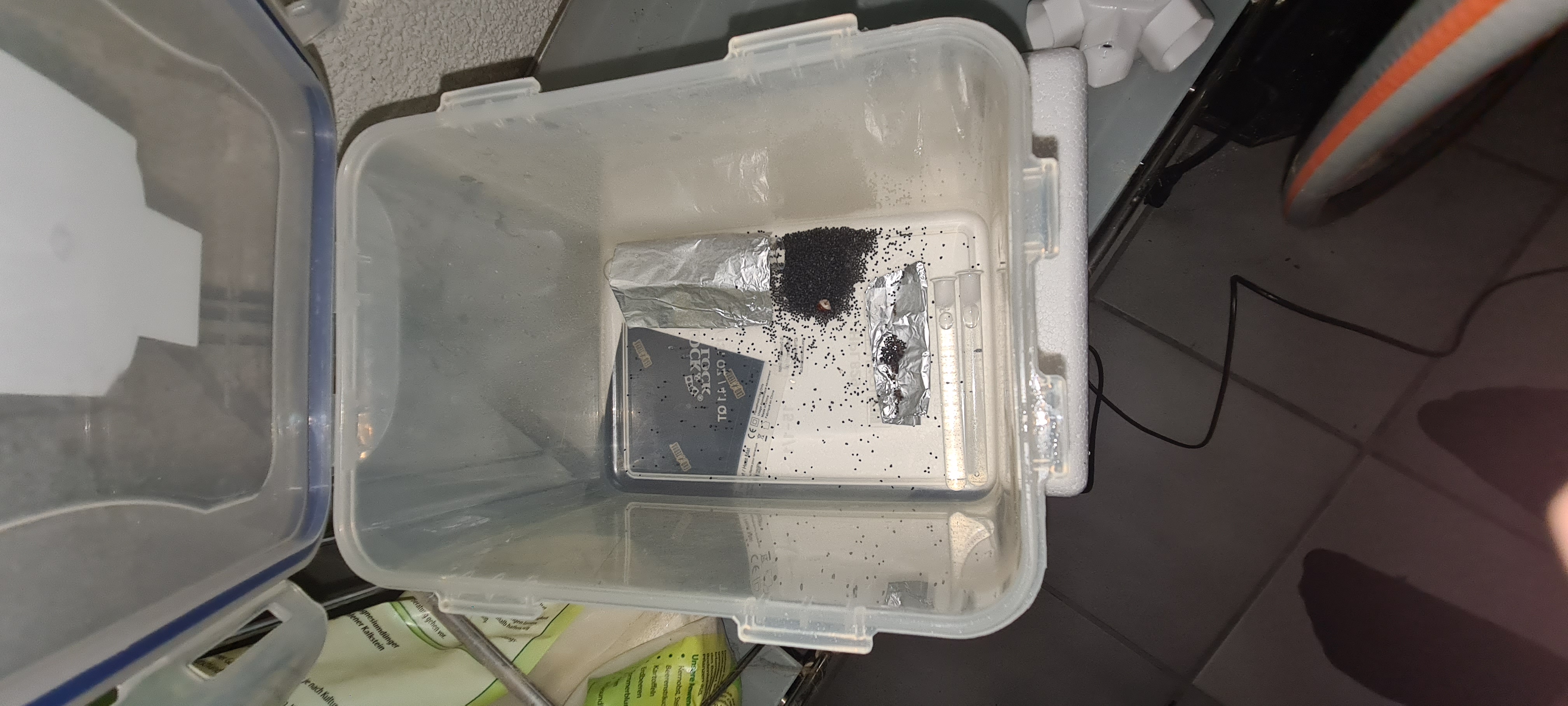 Also frisch ans Werk, provisorische Box parat gemacht, Zuckerlösung und Wasser im Reagenz rein, Heizmatte unter ein Viertel der Box gelegt, 15 Fruchtfliegen auf einem Alutellerchen dazu und nun ganz in Ruhe in das Regal gestellt.
