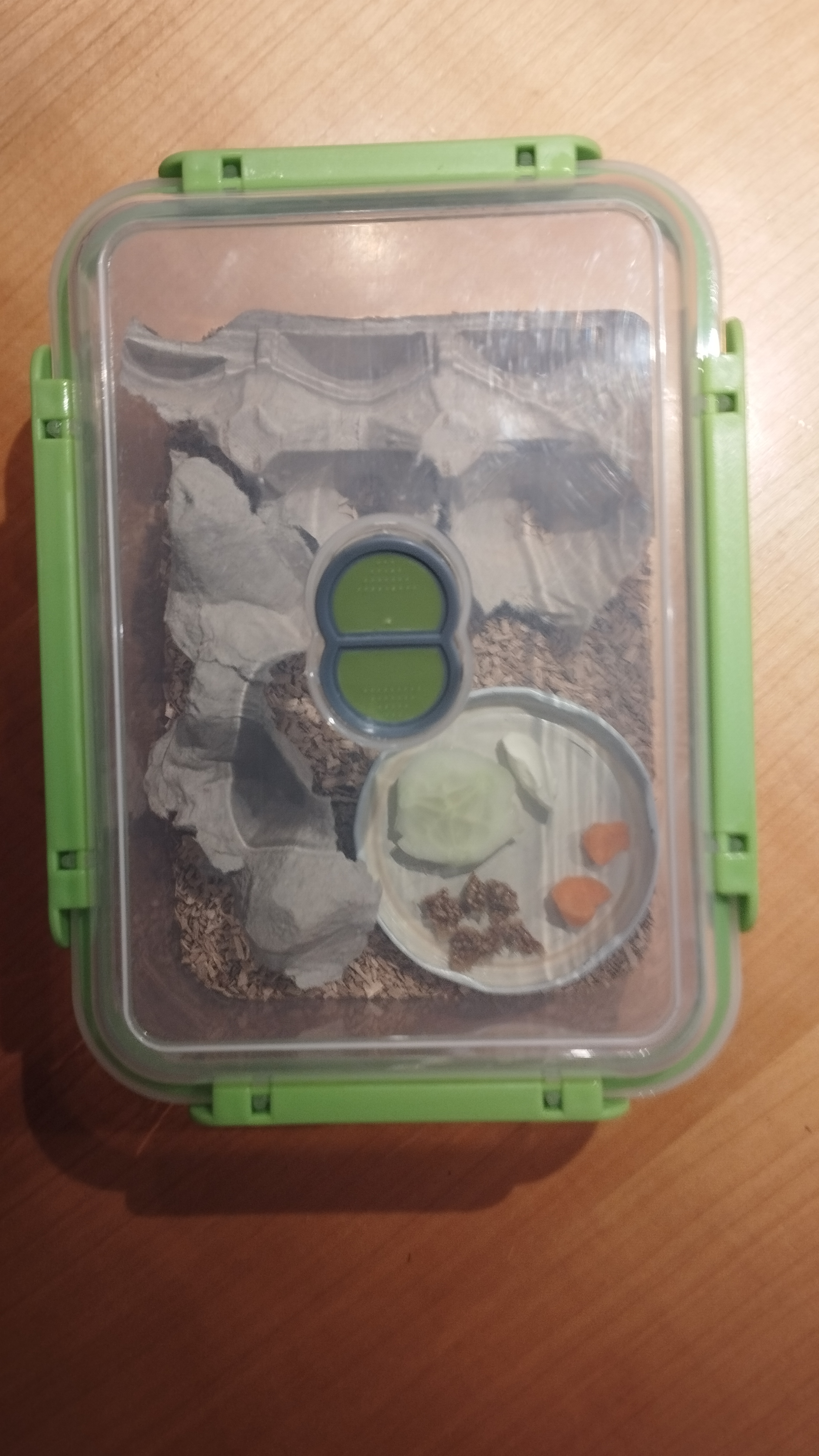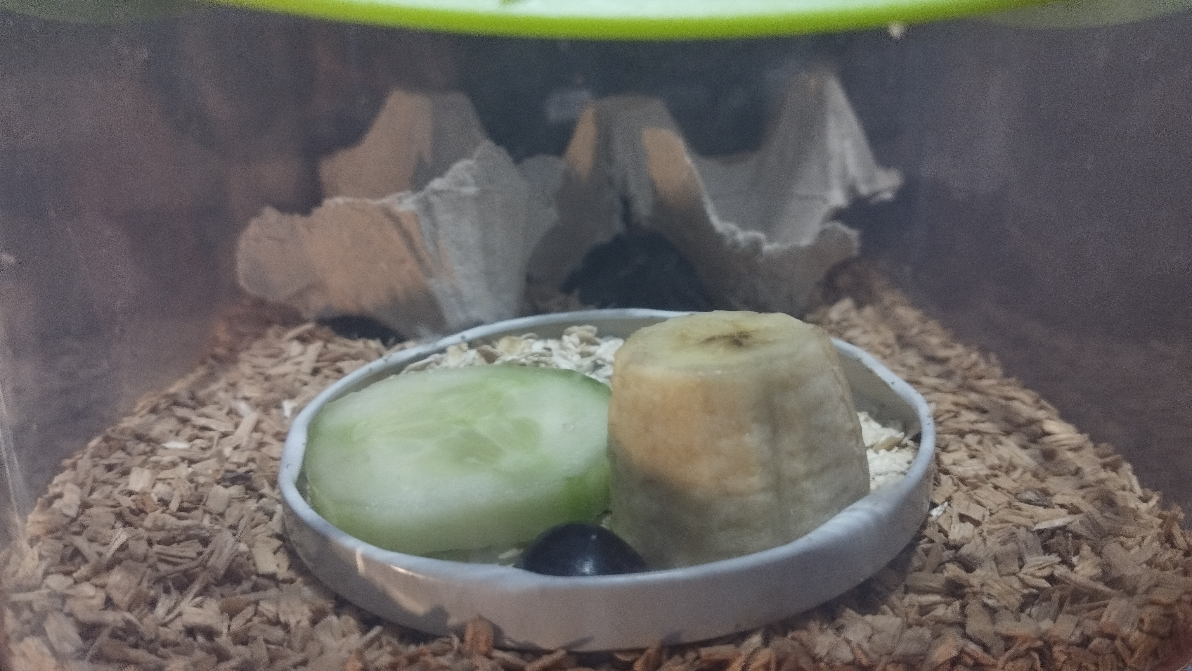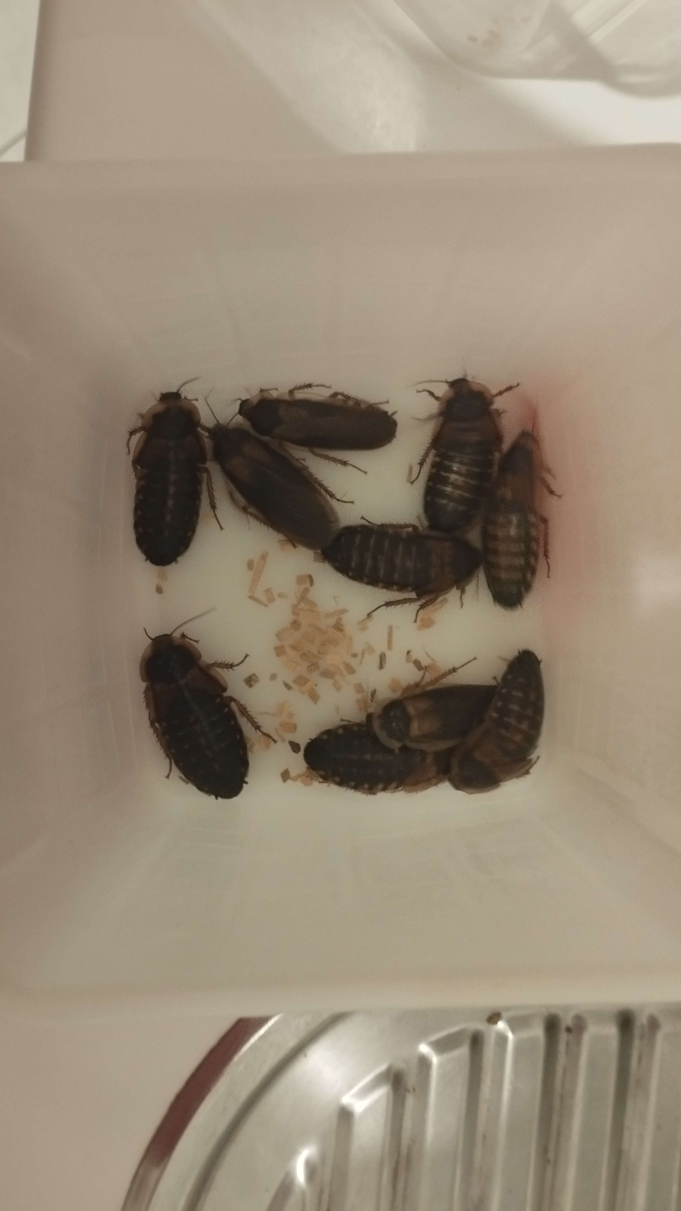So viel schonmal dazu, desweiteren habe ich bemerkt, dass ich das Gemüse wohl 1-2 Tage zu lange drin hatte, sodass sich auf der Futterschale langsam Schimmel gebildet hat. Dementsprechend (und weil es sicherlich auch so nicht schaden kann) habe ich die Schaben einmal kurz 10 Minuten umgesiedelt und in der Zwischenzeit die kleine Plastikbox (die bald aber größer werden wird) gesäubert, sprich mit Wasser abgewaschen, die Holzspäne gewechselt und neue Eierkartons hinein gelegt. Aber seht selbst:
