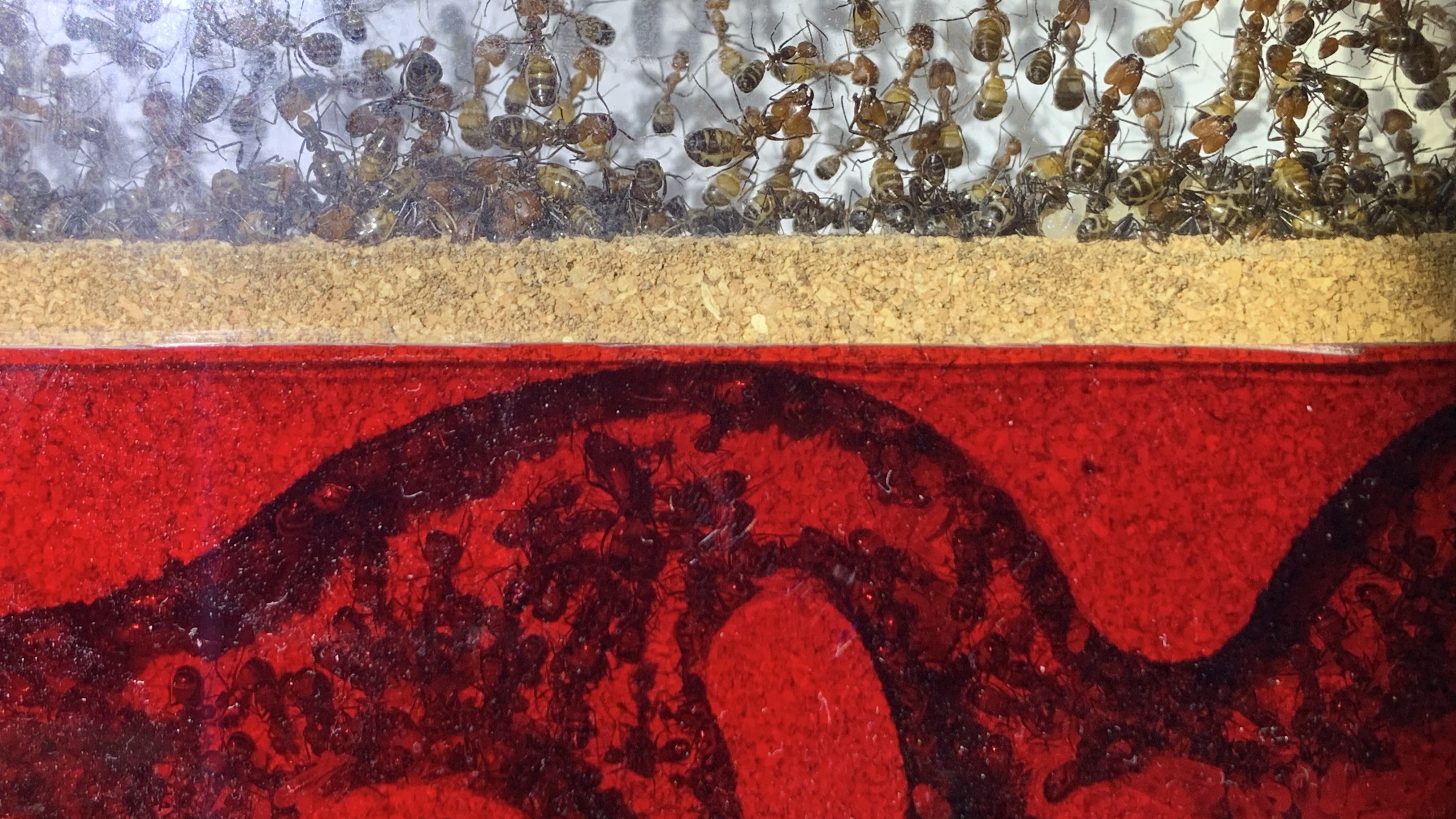 Da ist mir dann noch etwas passiert, ich hatte eine Heizmatte an meinem allerersten Nest, die hatte ca. 2cm Abstand vom Nest und funktionierte wunderbar. Ich wollte den Ameisen einfach eine Möglichkeit bieten bei Bedarf in ein wärmeres Nest zu ziehen. Funktionierte tadellos. Aber vorgestern Abend muss mir die Heizmatte beim beobachten oder Füttern der Ameisen rüber an das Glas vom Nest gedrückt worden sein und es ist mir nicht aufgefallen!