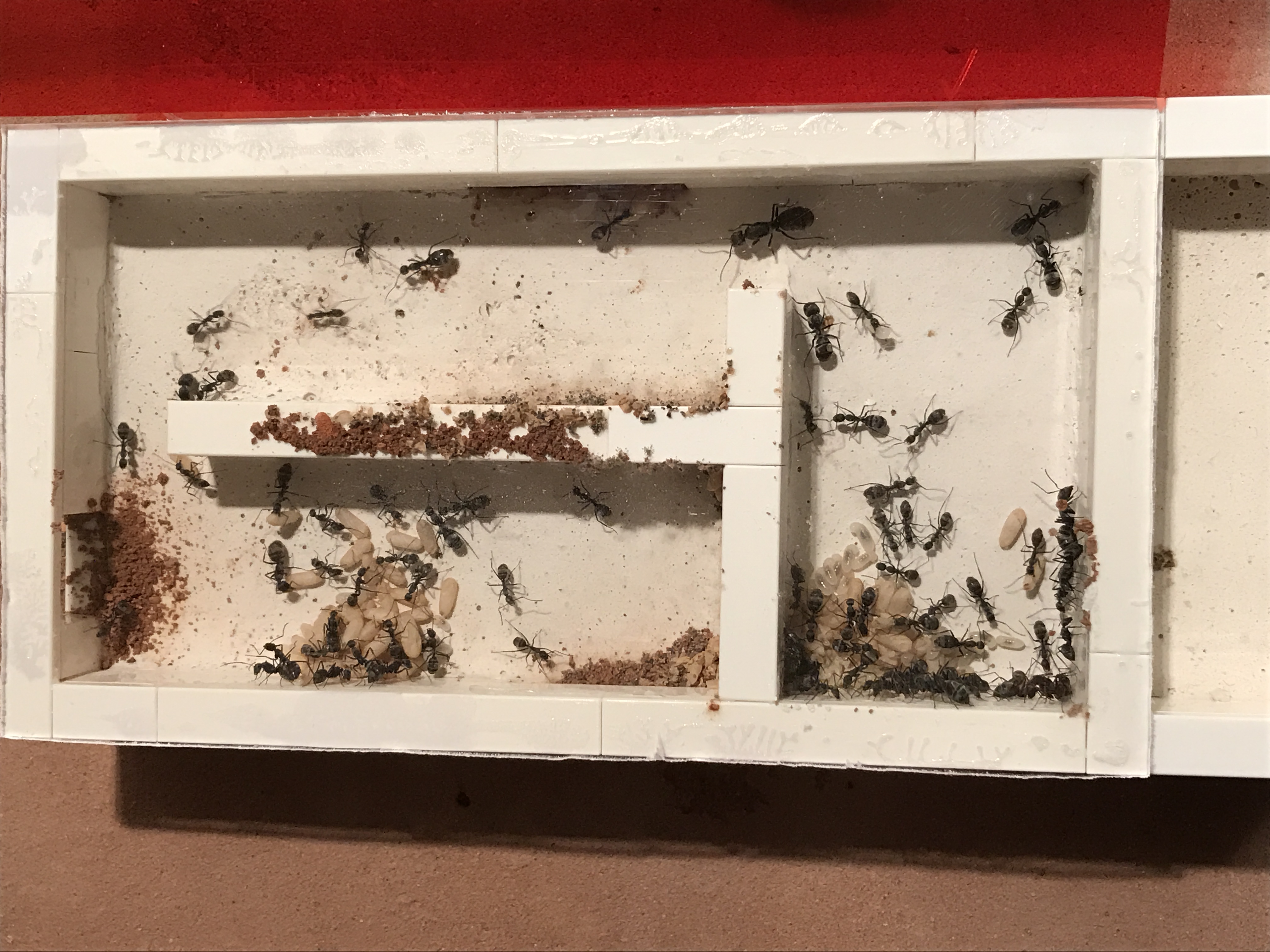 Leider komme ich auch nicht mit guten Nachrichten - keine Sorge, den Kleinen geht es prĂ€chtig und die Kolonie gedeiht. Ich schĂ€tze mal es sind so ĂŒber 1000 Arbeiterinnen mitlerweile und sie haben sich im neuen Nest ausgebreitet, aber auch den Bodengrund unterhöhlt und es sich dort gemĂŒtlich gemacht. Hier mal ein paar Bilder, wenn auch mehr schlecht als recht...Ich habe leider momentan keine gute Kamera.