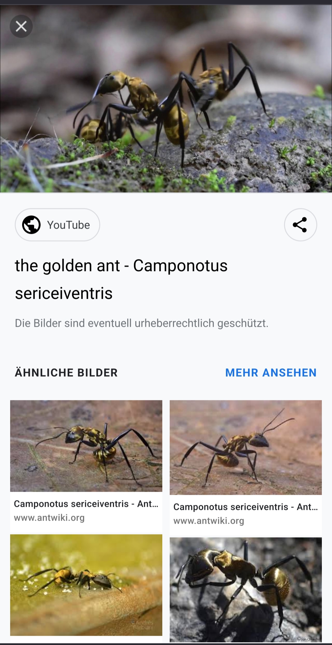 ...und das dutzendJoschi ↑12. September 2023, 19:20Diese Art ist eine von mehreren goldenen Camponotus in der mittelamerikanischen Region. Camponotus hat über 1000 Arten und nur eine handvoll davon sind in Umlauf. Wenn es eine goldene Camponotus sein muss, gibt es viele Alternativen wie C. fulvopilosus, die leichter zu bekommen sind. Wenn es unbedingt diese Art sein muss und der Preis keine Rolle spielt, bucht man sich einen Flug und fängt ein dutzend Königinnen selbst. Für müde 1000 Euro kommt man z.b. zehn Tage lang all-inklusive in die Dominikanische Republik.