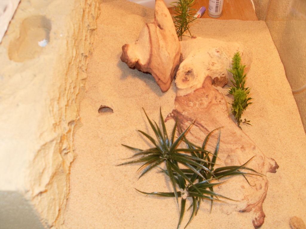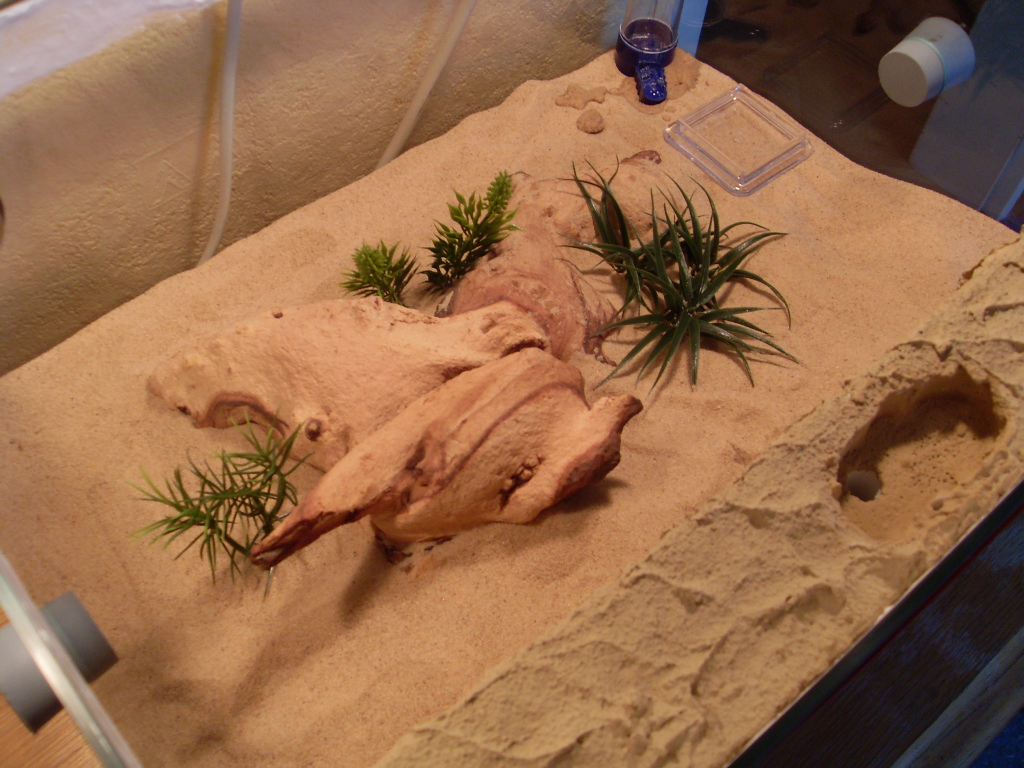 Als Behausung dachte ich an zwei 40x30x20 Becken, mit Ytong, Wüstensand und ein paar Dekoblumen. Das Einrichten des Nestbeckens hat ca. 30 Minuten gedauert da ich dieses mal den höheren Preis, gegenüber dem Handwerk vorgezogen habe (sorry, bin Faul