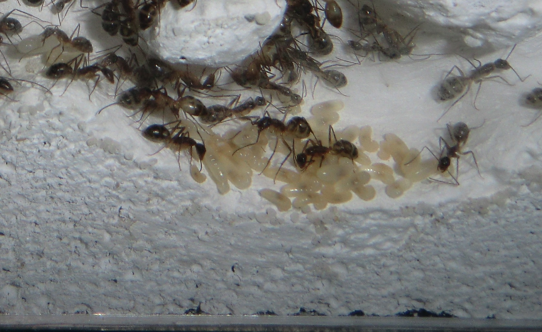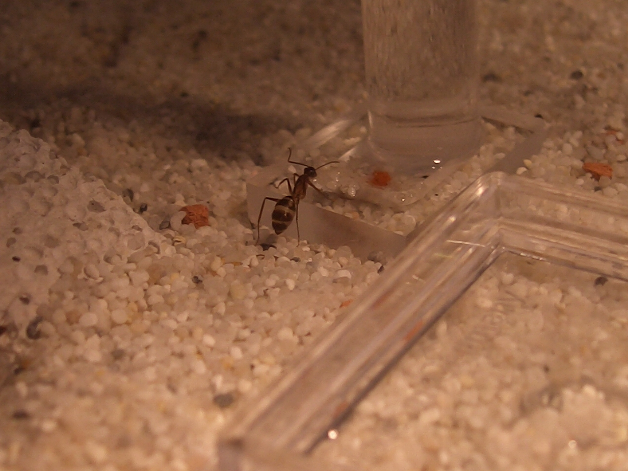 Die Kolonie wÀchst gut, sie fressen jeden Tag 1-2 Heimchen oder Mehlwurm. Das Zuckerwasser decken sie immer mit Steinchen zu. 8 Arbeiterinnen und