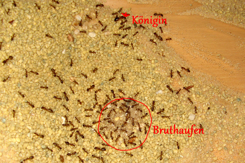 Nunja, da die Brut zurückging und ich mal testen wollte, wie das mit der Futterzugabe zusammenhängt (wollen sie denn doch mehr Nahrung?), habe ich mal etwas häufiger zugefüttert (immer schön vor den Einagng gelegt [faule Mistviecher]). Das Ergebnis sind einige aufgeteilte neue Bruthaufen mit vielen kleinen Larven und Eiern. Das ist auch fast die einzige momentane Brut, denn Puppen sind nur noch wenig übrig und deshalb sind auch recht wenig Ameisen dazugekommen (nur 130 in 2 Monaten!), was natürlich auch an den niedrigeren Temperaturen liegt, schließlich sollen die Ameisen auch mal eine kühlere Phase erleben (wie im Heimatland in unserem Sommer der Fall).