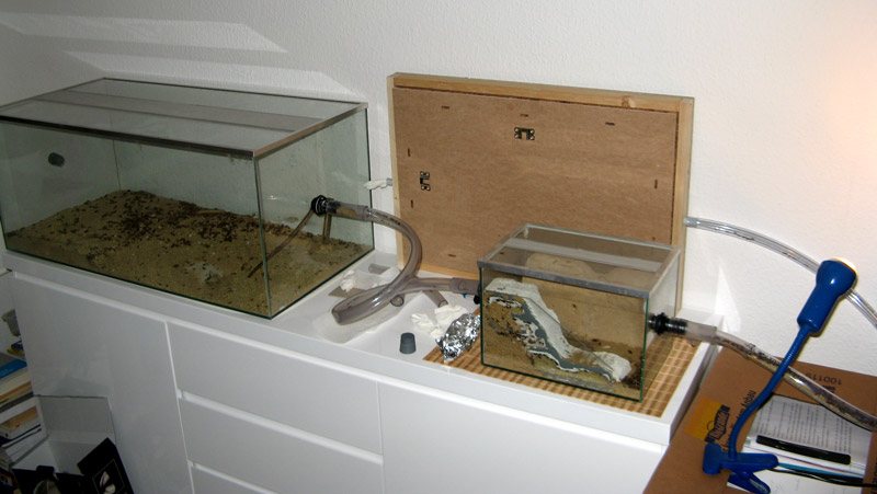 Es ist etwa 64cm breit und 44cm hoch. Ich habe zwei Lagen Kork übereinander gelegt (Baumarkt) und mit einem Fräsaufsatz die Kammern hineingefräst, was eine ganz schöne Arbeit war. Im vorherigen Beitrag sieht man schon ein Bild davon. Die Korklagen habe ich auf eine Holzplatte geklebt und das Ganze mit Holzleisten eingerahmt. Dann wurde auf die Korklagen eine Glasplatte (vom Bilderrahmen, Baumarkt) geklebt. Darüber wurde dann noch mal eine „Deko-Kork-Tapeten-Lage“ geklebt, einfach, weil es nett aussieht. Jeweils ein Stück eingeklebtes Kunststoffröhrchen dient rechts und links an dem Nest als Anschluss für einen Schlauch.