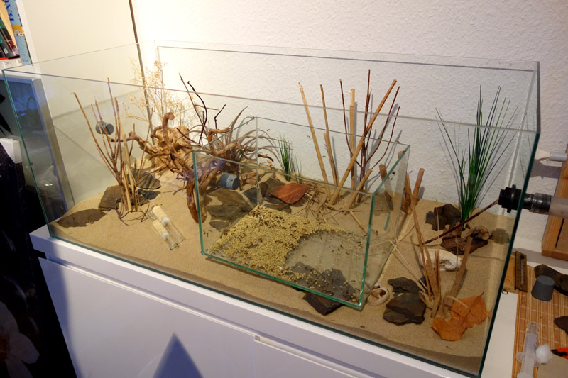 Ich holte das kleinste Nest, das eigentlich aus dem Becken verschwinden sollte aus dem Bodengrund hervor, denn dort sollte nun das neue Nest versenkt werden, was auch geschah. Da das kleine Nest noch benutzt wurde, musste ich es in die Mitte des Beckens zwischen die beiden neuen Nester stellen und dazu fast die gesamte Einrichtung rausrupfen.