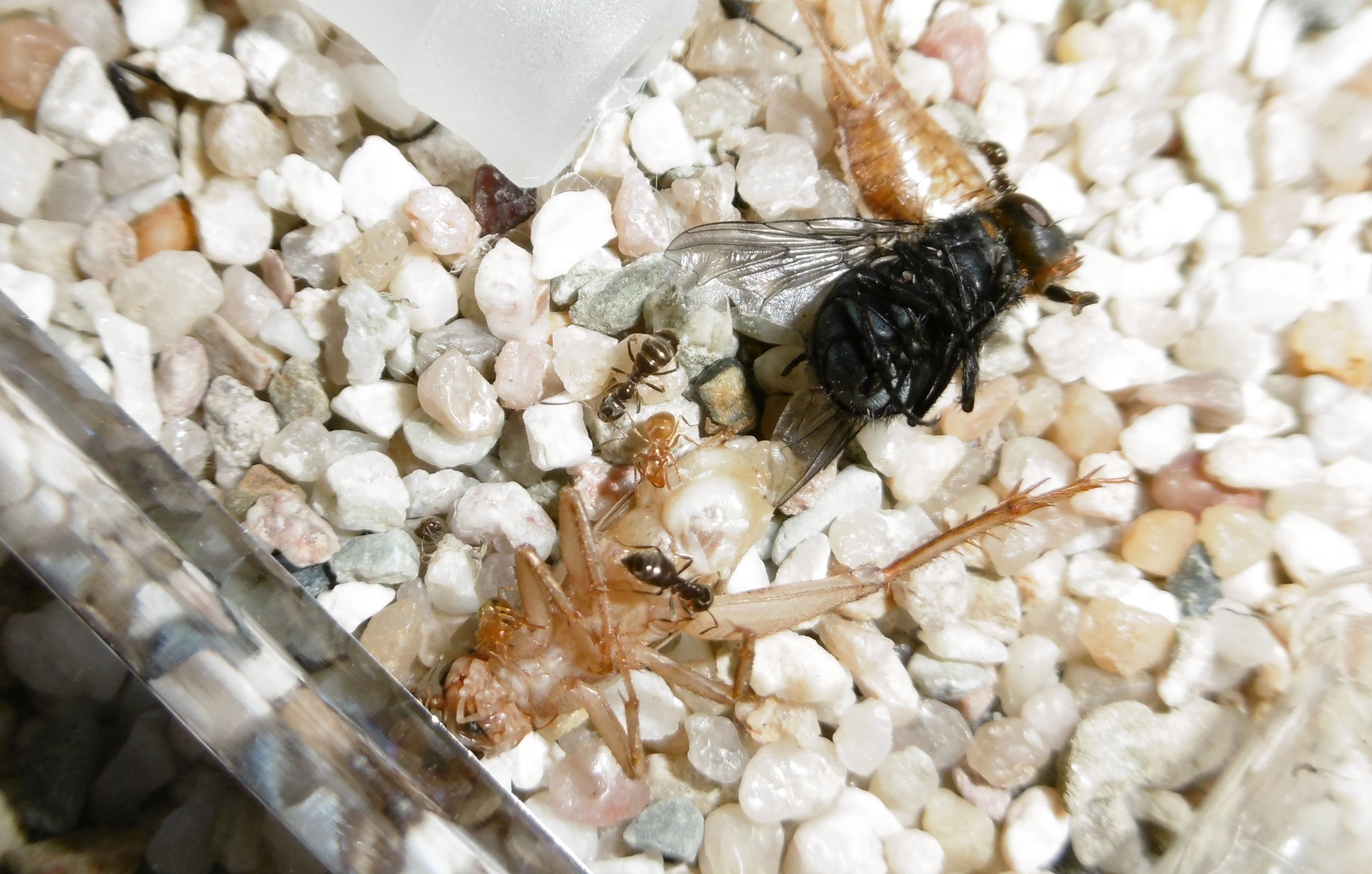 Heute hat es ein zerteiltes Heimchen und eine Fliege gegeben. Wirtsarbeiterinnen und Chthonolasius-Arbeiterinnen beteiligen sich gemeinsam am Zerlegen der Futtertiere: