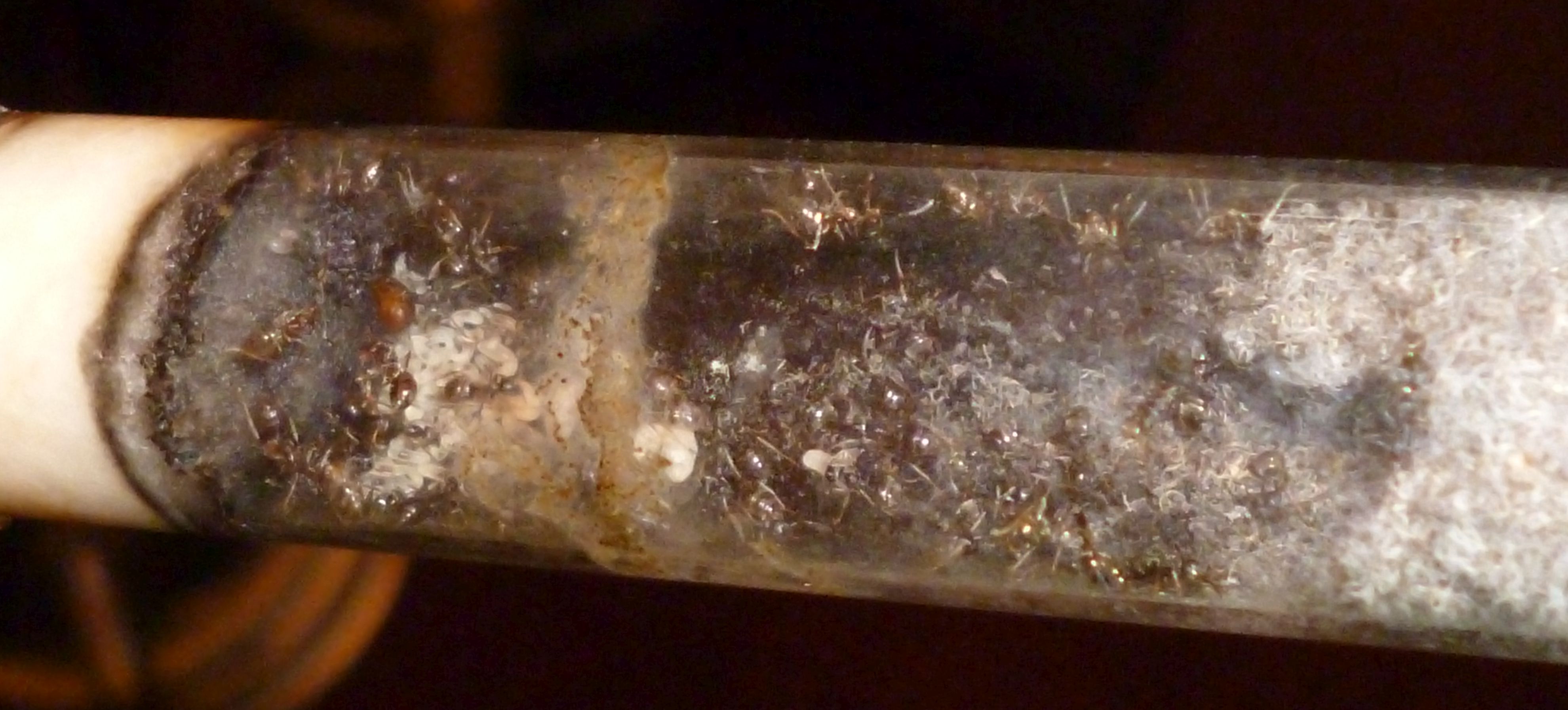 Die Wirtsarbeiterinnen nehmen in ihrer Zahl langsam aber sicher ab. Immer wieder sterben einzelne Arbeiterinnen, vermutlich an Altersschwäche. Es wird allerhöchste Zeit, dass die erste Welle von Schattenameisen schlüpft, sonst ist bald niemand mehr da um sich um die Nahrungsversorgung zu kümmern. Es sind aber noch 30+ Wirtsarbeiterinnen, trotzdem macht mich dieses stetige Arbeiterinnensterben nervös, wegen der gleichzeitigen Stagnation bei der Brutentwicklung.