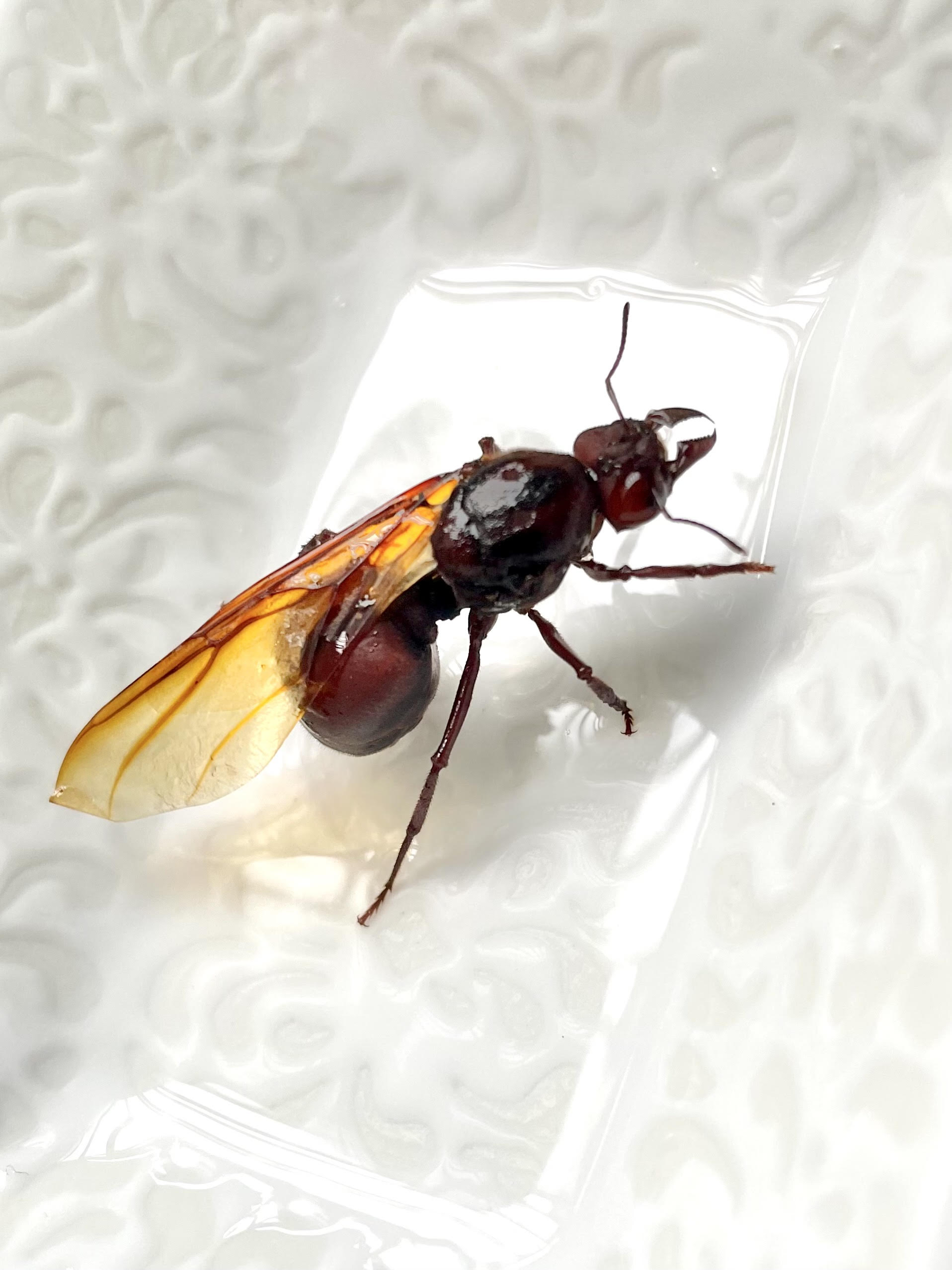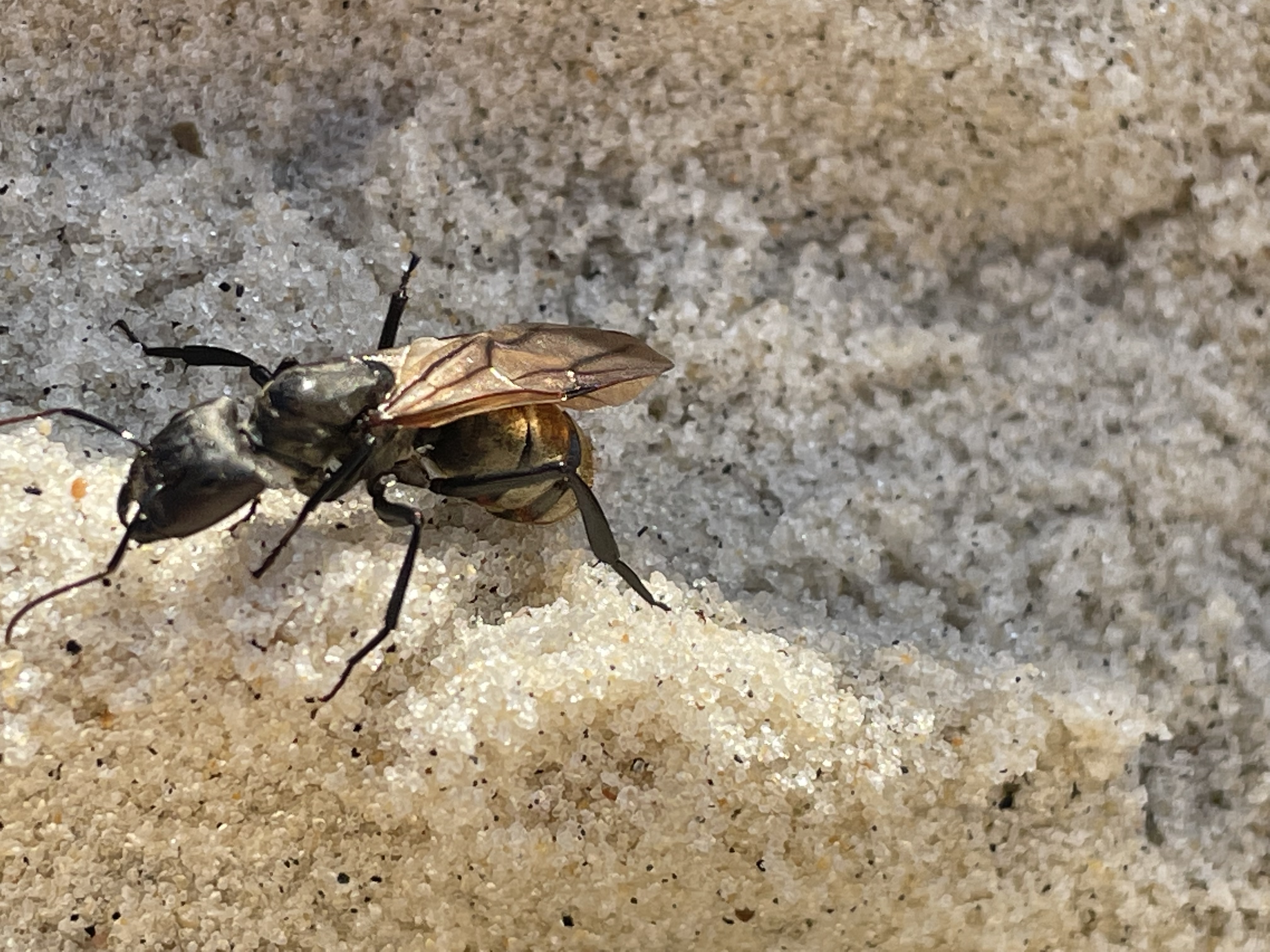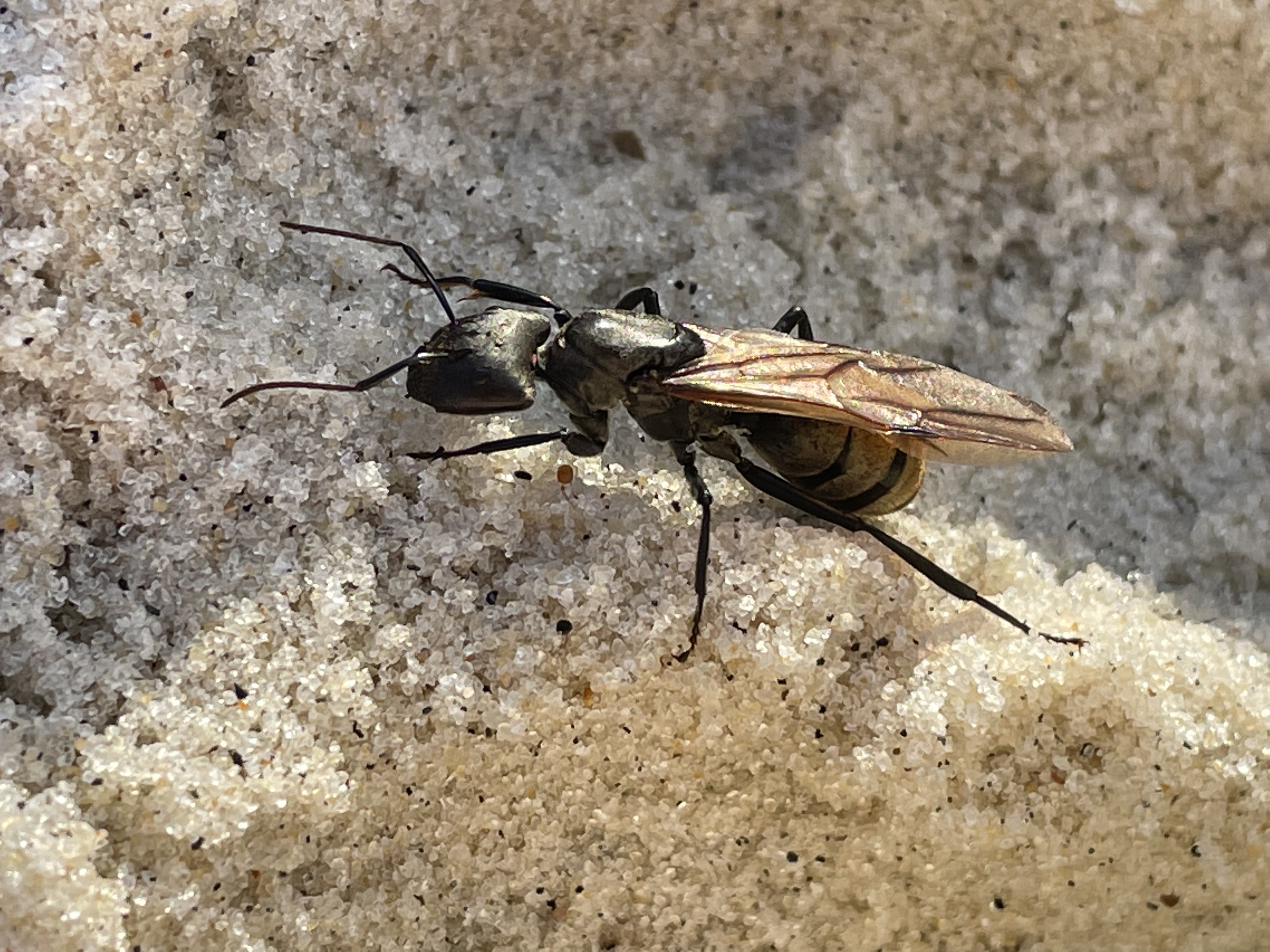 Der Strand war voll mit Dutzenden, wenn nicht Hunderten von wespenartigen Insekten, dunkelbraun, Körperlänge ca 1,5 cm, die alle tot oder am Sterben waren. Daher habe ich gleich vermutet, dass es sich um Ameisen-Drohnen handeln könnte. Während meine Jungs die Tiere einsammelten, um sie zu begraben, fiel ein Tier besonders auf, das noch lebte, bereits einen Flügel abgeworfen hatte und mehr als doppelt so groß war. Diese mutmaßliche