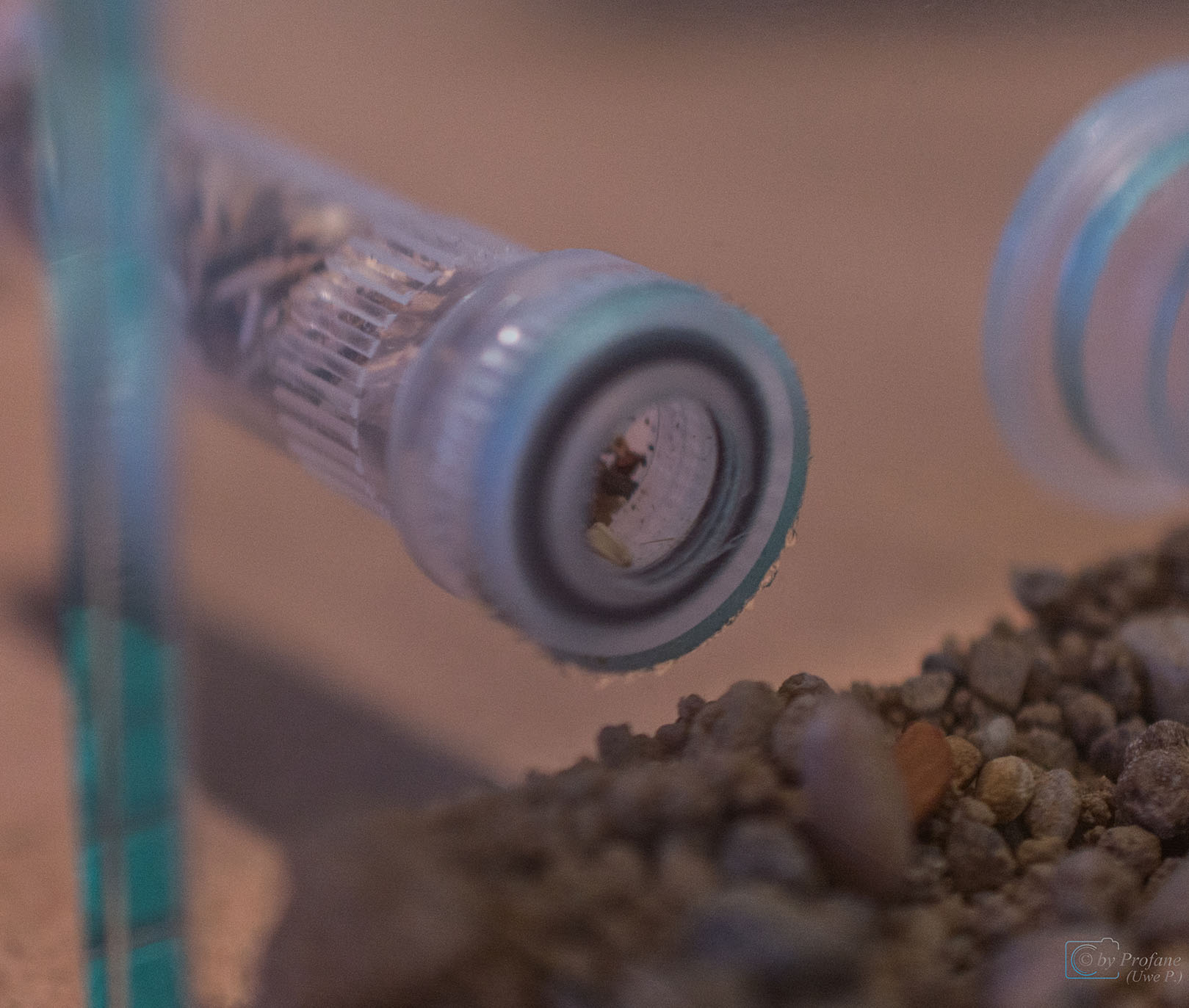 Nachdem ich die Farm aufgebaut und das Nest befeuchtet habe, habe ich die Ameisen noch einen Tag lĂ€nger im Reagenzglas außerhalb der Arena gelassen. Bis alles getrocknet ist.