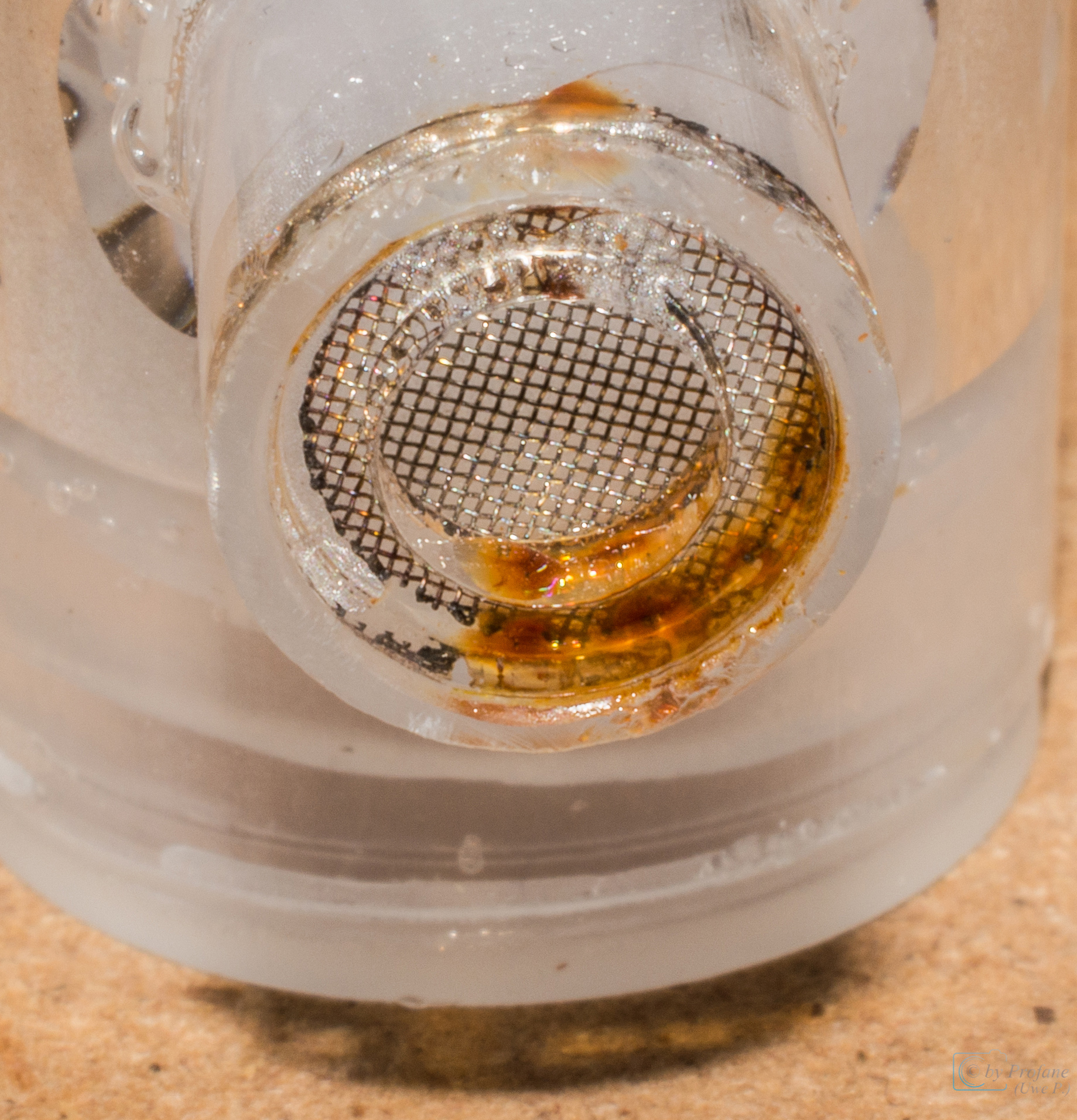 Inzwischen sind wir bei sechs Arbeiterinnen. Mir ist aufgefallen dass das kleine Gitter in der TrĂ€nke anfĂ€ngt zu rosten. Ich habe deswegen die TrĂ€nke erst mal gegen einen kleinen Napf ausgetauscht. Halbvoll mit Wasser und dann mit Watte gefĂŒllt. Damit die kleinen nicht ertrinken.