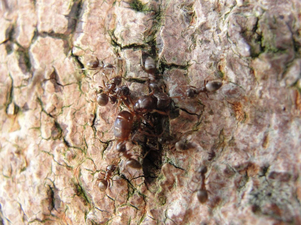 Im Garten schau ich nach, ob sich vielleicht noch andere Gynen verirrt haben. Am Bergahorn werde ich fĂŒndig, da gibt es eine Ameisenstrasse von vermutlich Lasius