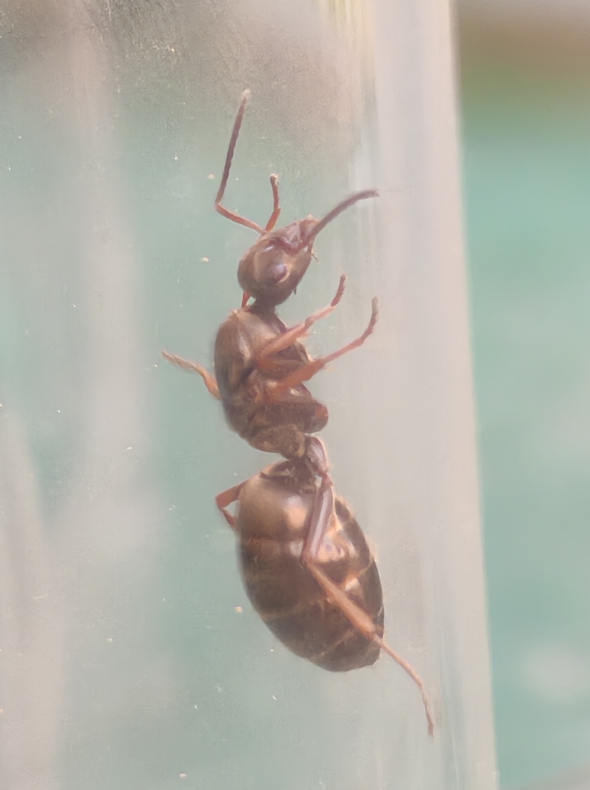 Ca. so groß wie eine Lasius NigerKönigin , die Farbgebung ist Rot-Braun.