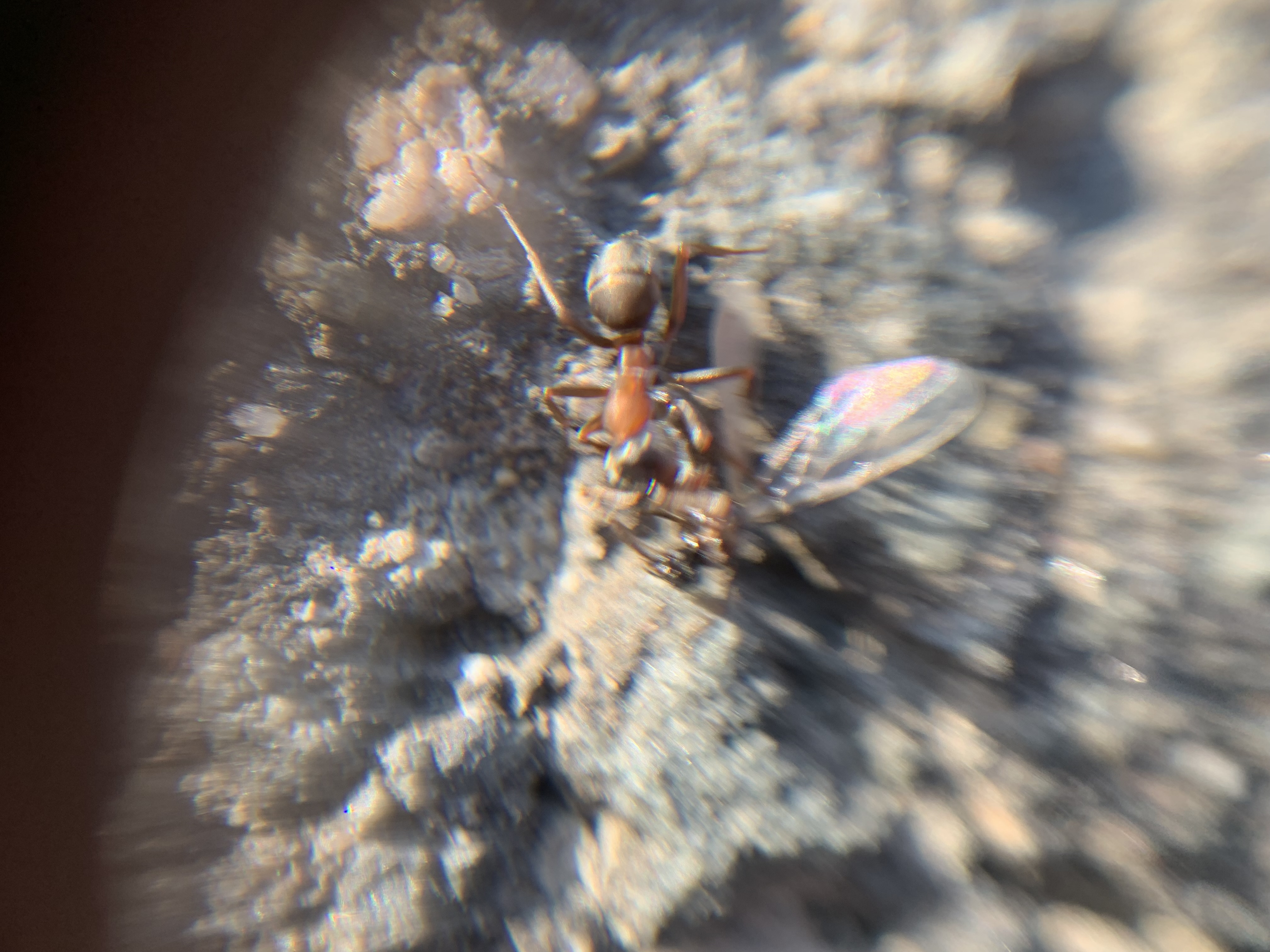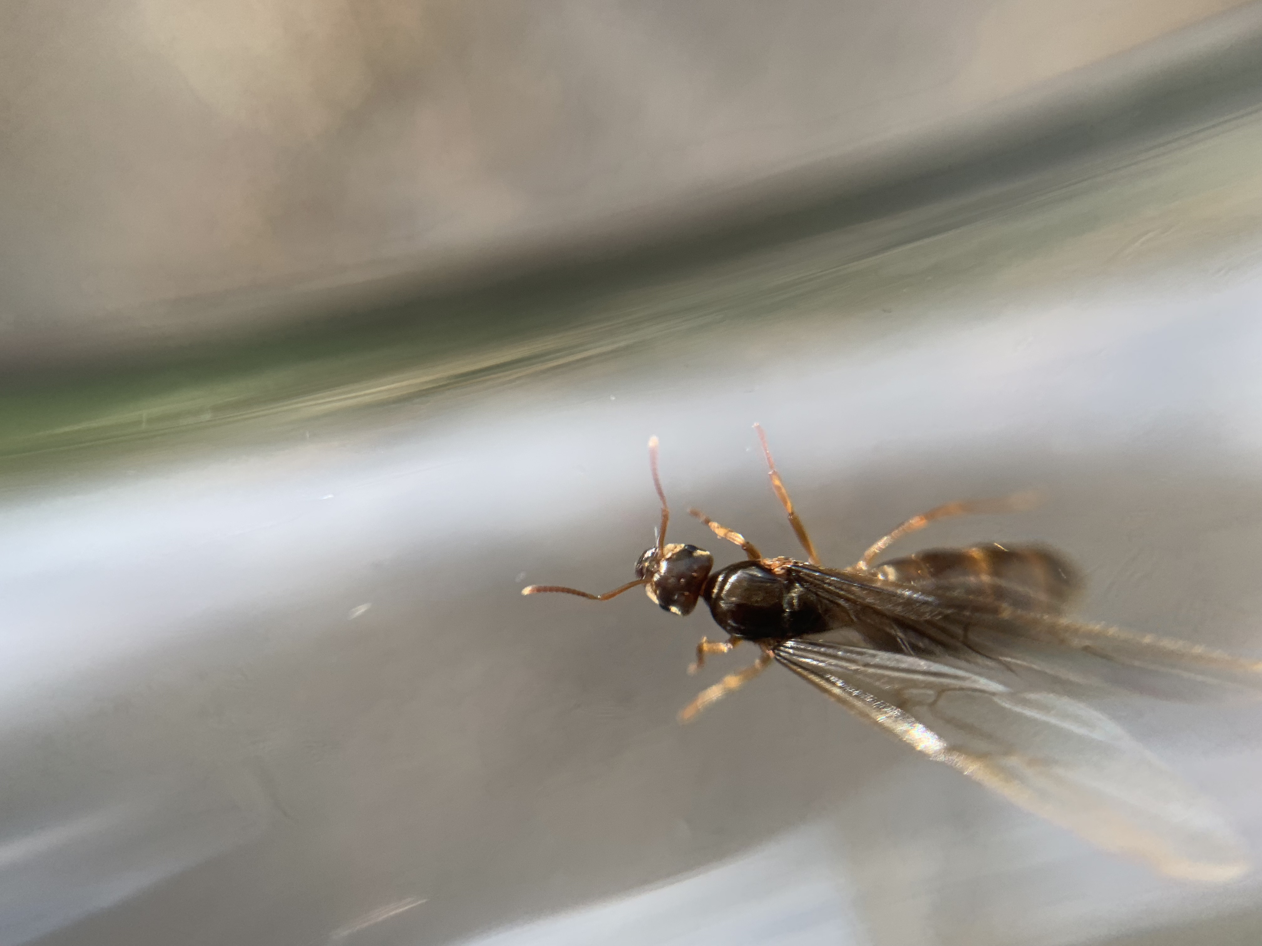 Gerade bin ich in einen wahnsinnigen Schwarmflug gekommen. Das waren bestimmt an die 1000 Tiere, die am Boden und in der Luft unterwegs waren. Aber keine Ahnung welche Art. Auch konnte ich nicht wirklich unterscheiden zwischen Männchen und Weibchen, es gab keinen wirklichen Größen unterschied. Interessant fand ich, dass ich dieses Exemplar beobachtet habe, wie es mit einer anderen Ameise gerangelt, und die andere Ameise direkt im Anschluss tot war, war das das Mädchen? So schnell?