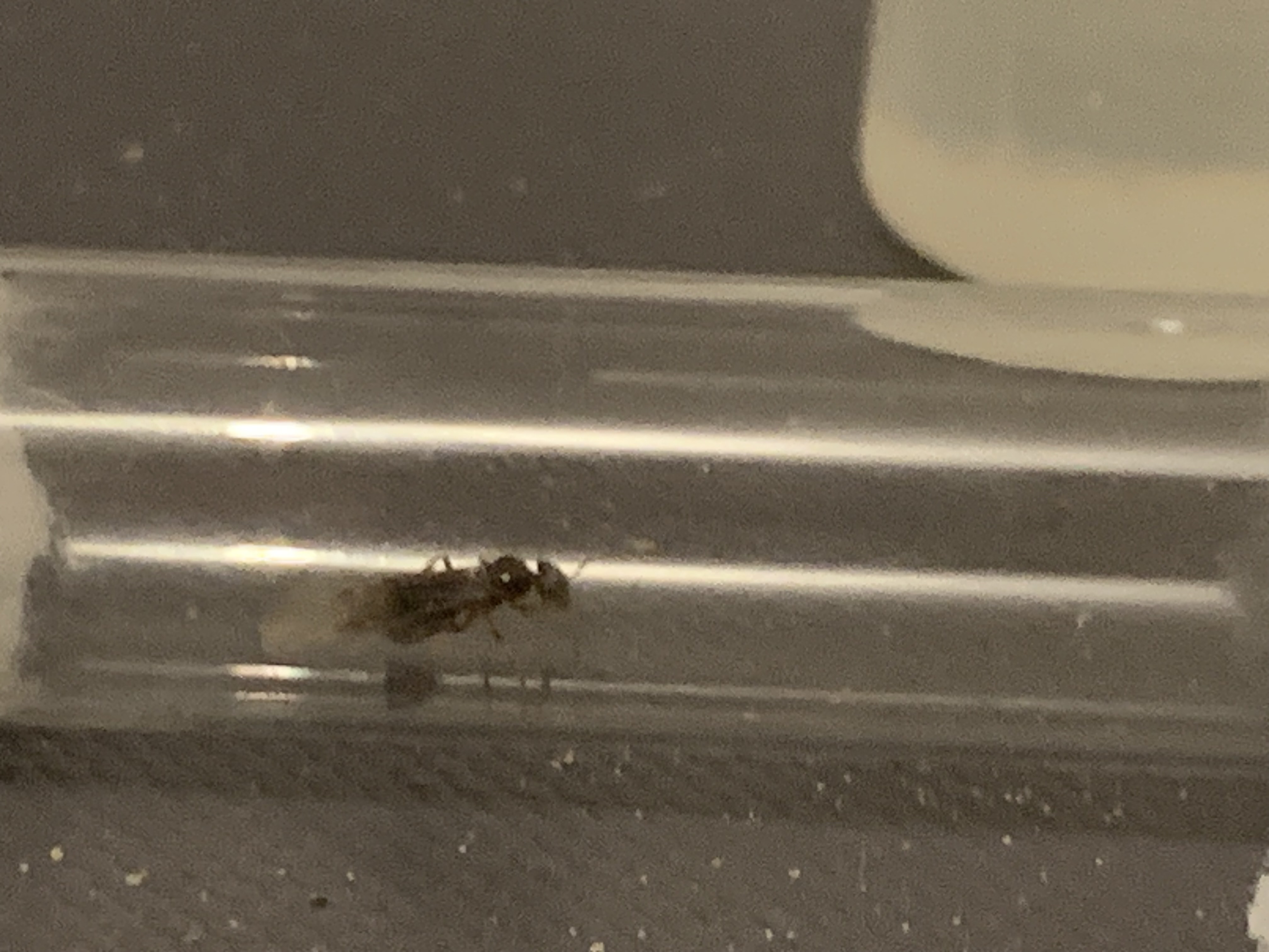 Als ich sie gefunden habe, hatte sie noch einen Flügel, den sie bald danach abgeworfen hat. Die Körperlänge ist etwa 8mm, im letzten Bild ist ein Zollstock unterm Reagenzglas als Maßstab.