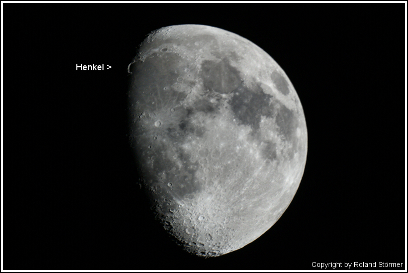 Heute um 15.03 Uhr wäre bei dem zu 76% beleuchteten Erdmond der „goldene Henkel“ zu sehen gewesen. Leider herrschte zu dieser Zeit noch Tag. Ich habe dann gegen 18.00 Uhr noch einen kleinen Rand davon abgelichtet.