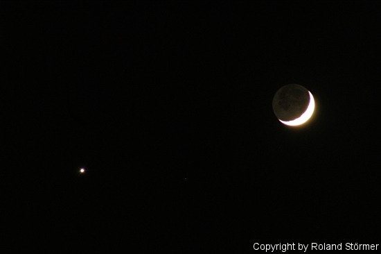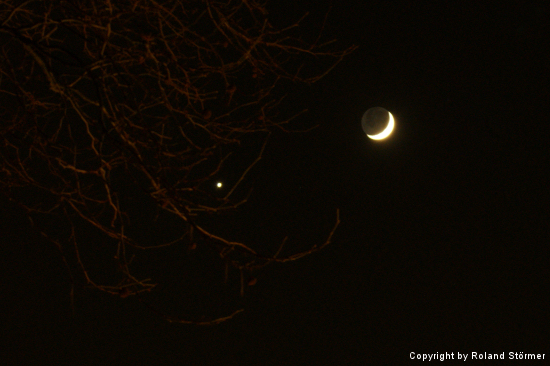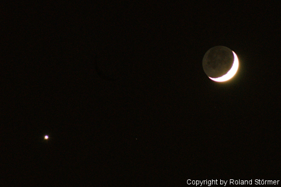 Morgen Abend (30.01.2009) steht die durch Erdlicht erhellte Mondsichel beim hell strahlenden Abendstern, der Venus. Der Mond geht um 22 Uhr im Westen unter und hält sich im Sternbild Fische auf. Die Sichel ist zu 17% beleuchtet.