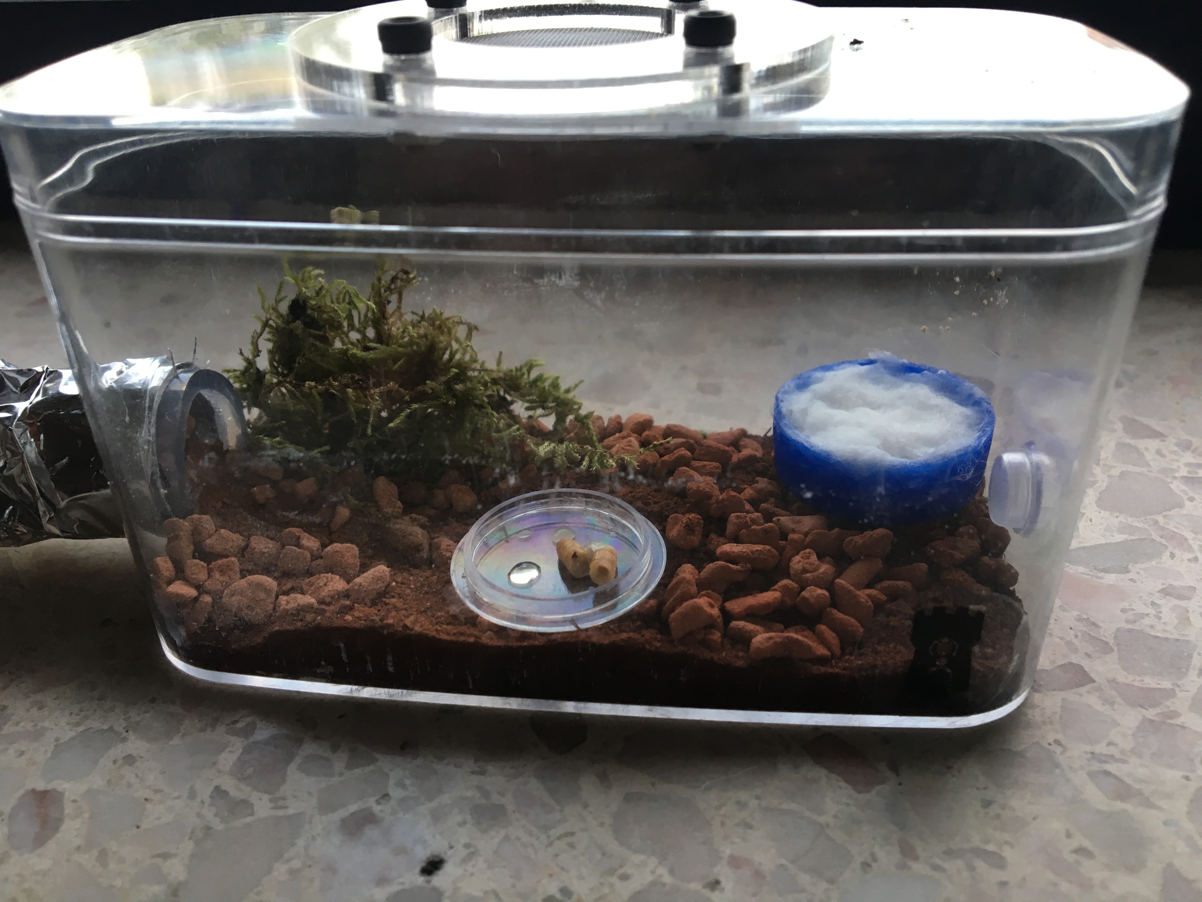 Ich habe die Arena mit etwas Sand-Lehm Bodensubstrat gefüllt und noch etwas Seramis dazu gegeben. Ein Flaschendeckel mit nasser Watte, und ein kleiner Napf zur Futterbereitstellung. Beim Eingang des Nests habe ich ein wenig Substrat und Seramis aufgehäuft um in nicht ganz so weit geöffnet zu lassen und die Kleinen beim Schutz des Nestes etwas zu unterstützen.