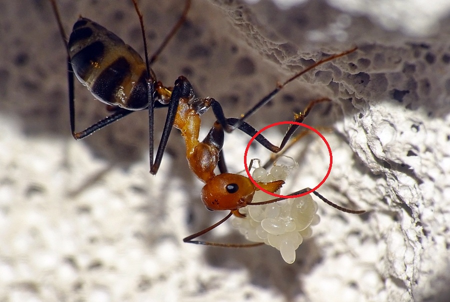 Meine Cataglyphis haben ĂĽberwiegend ihre Eier im Pulk herum getragen, allerdings, wenn auch selten, auch aufLarven gelagert.
