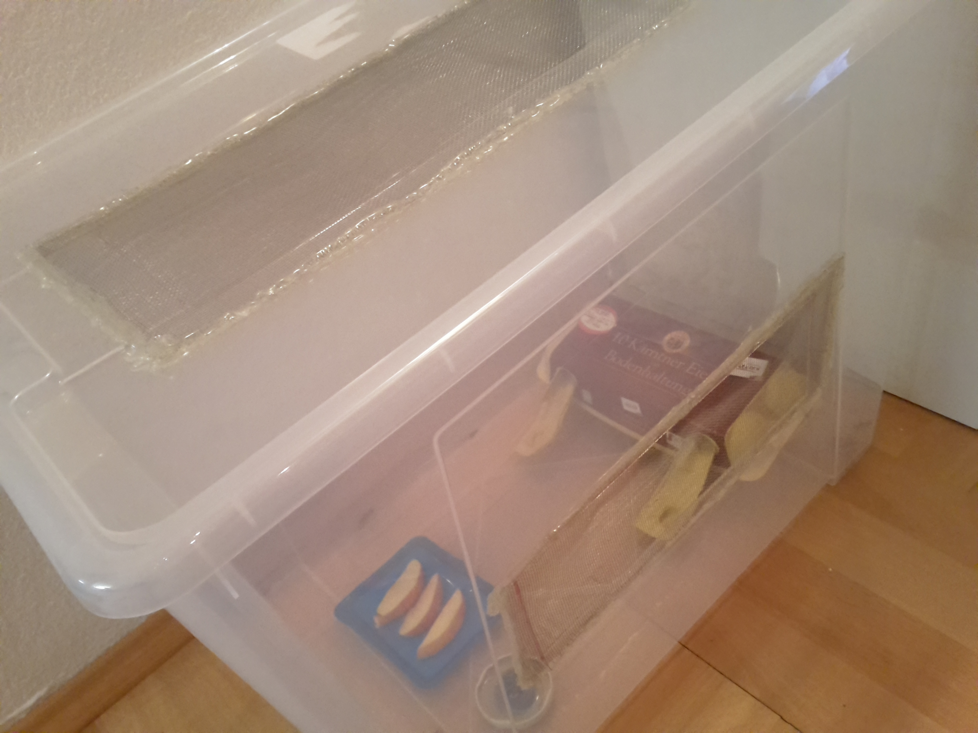 Haltung: Die Tiere haben wir bereits in dieser Verpackung gekauft. Unten befindet sich ein Nährboden und darüber eine Schicht aus Kunststroh (weil echtes Stroh schimmeln würde). Oben ist ein Deckel mit Loch, welcher für Luft sorgt. Unter dem Deckel ist eine schicht, die an Folienabdeckung aus dem Garten erinnert (eine Strumpfhose tut's auch!).