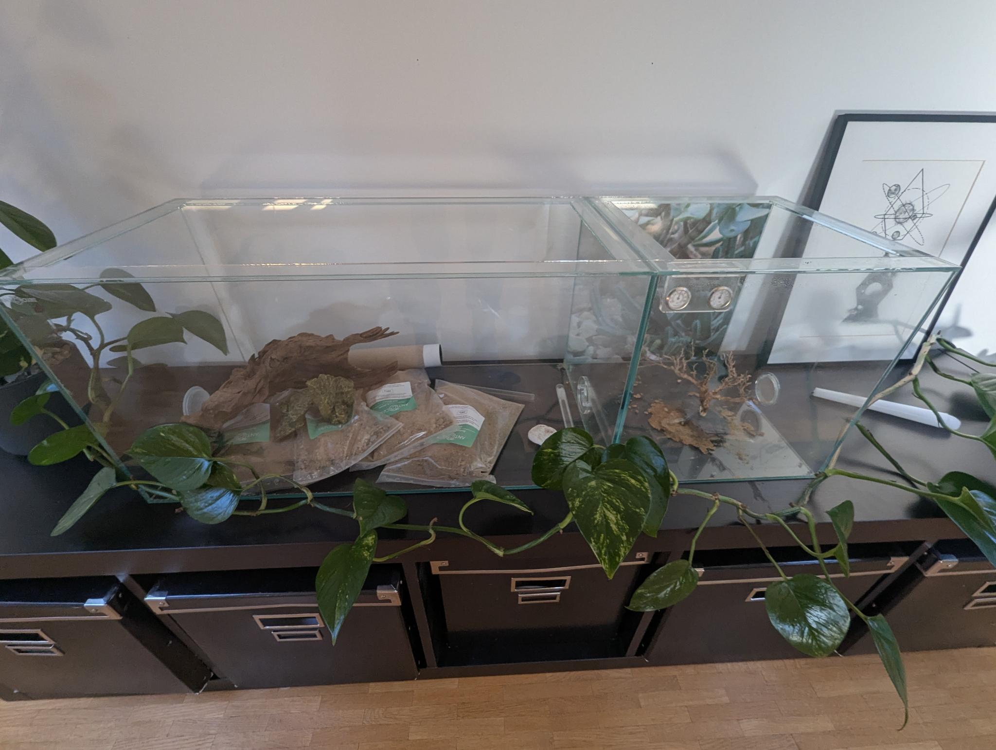 Die leichteste Idee wäre einfach beide mit Sand auszufüllen und etwas Deko. Ich denke so oder so macht es Sinn bei "Wüste" zu bleiben. Aber habt ihr vielleicht noch andere Ideen? Auch, wo soll ich Nahrung und Trinken anbieten? Eher weit weg oder eher näher?