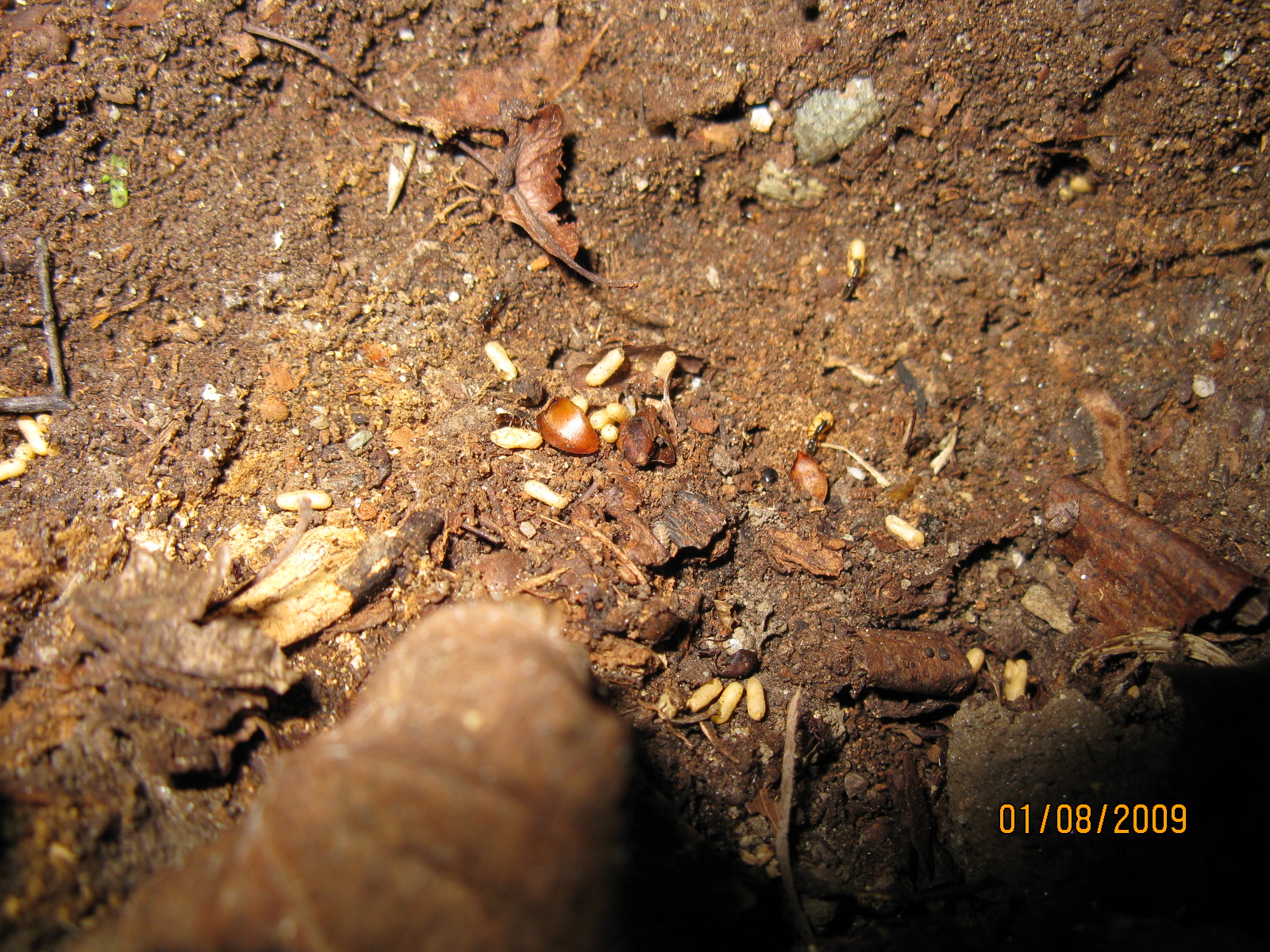 Neben den unseren Gastgeber bekannten Nestern fanden wir ein weiteres Nest dieser beeindruckenden Ameisen, außerdem fanden wir Nester von Ponera coarctata. Uns wurde ein recht untypisches Nest von Formica rufa gezeigt, die Tiere siedelten unter Gehwegplatten, die vor einer Rastbank verlegt waren.