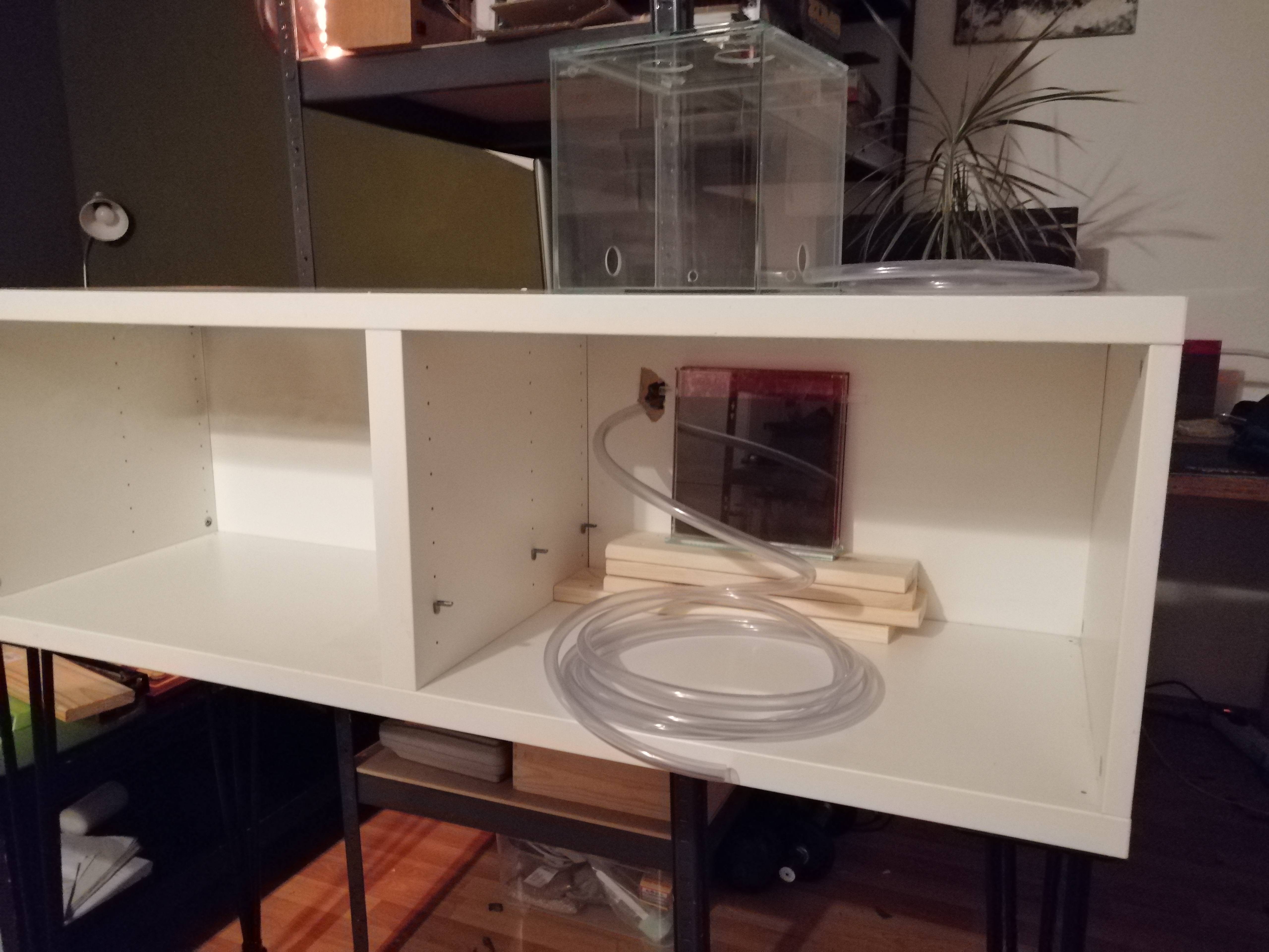 Heute ist endlich mein Ameisen Schrank fast fertig geworden. Wie auf den Bildern zu sehen ist der Schrank zweigeteilt. Der weiĂe "Raumtrenner" in der Mitte ist verschiebbar. Der rechte Raum soll noch etwas verkleinert werden und ist fĂŒr meine Messor barbarus Nester gedacht. Auf dem Schrank die Arena und dann geht es mit dem Schlauch hinunter in die Nester.