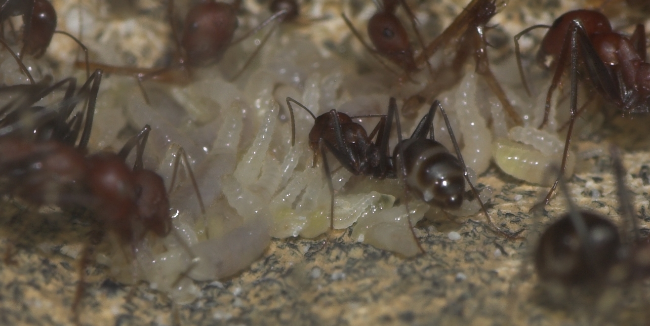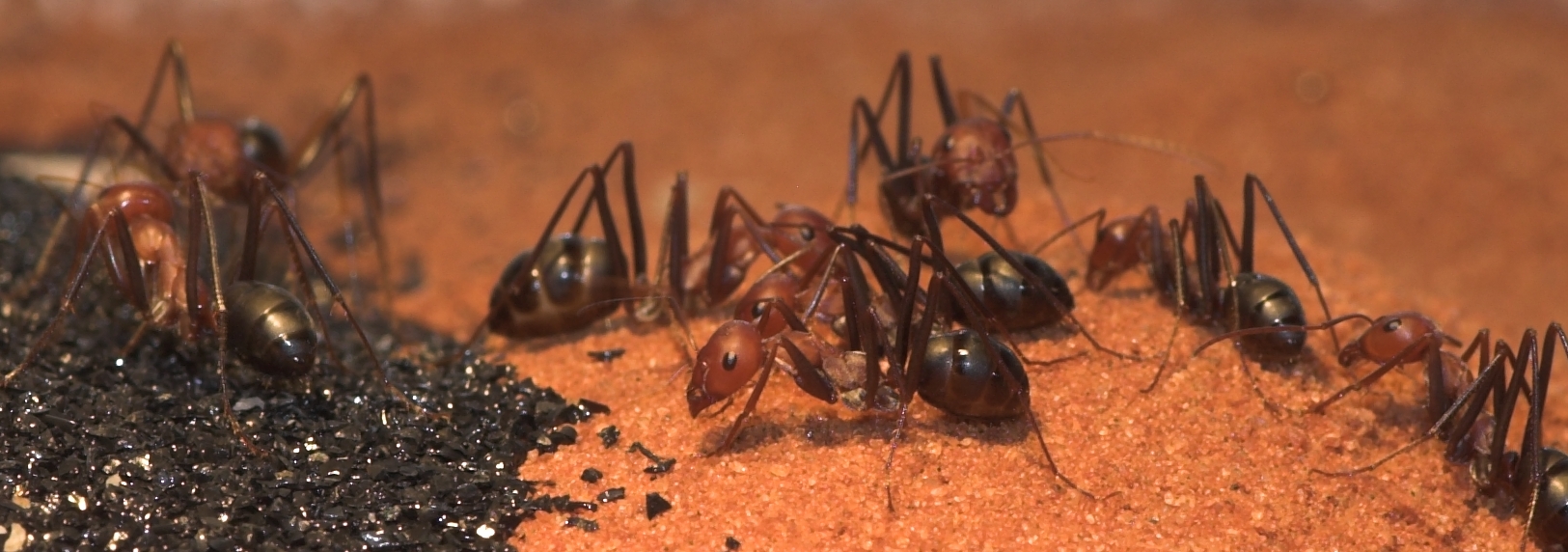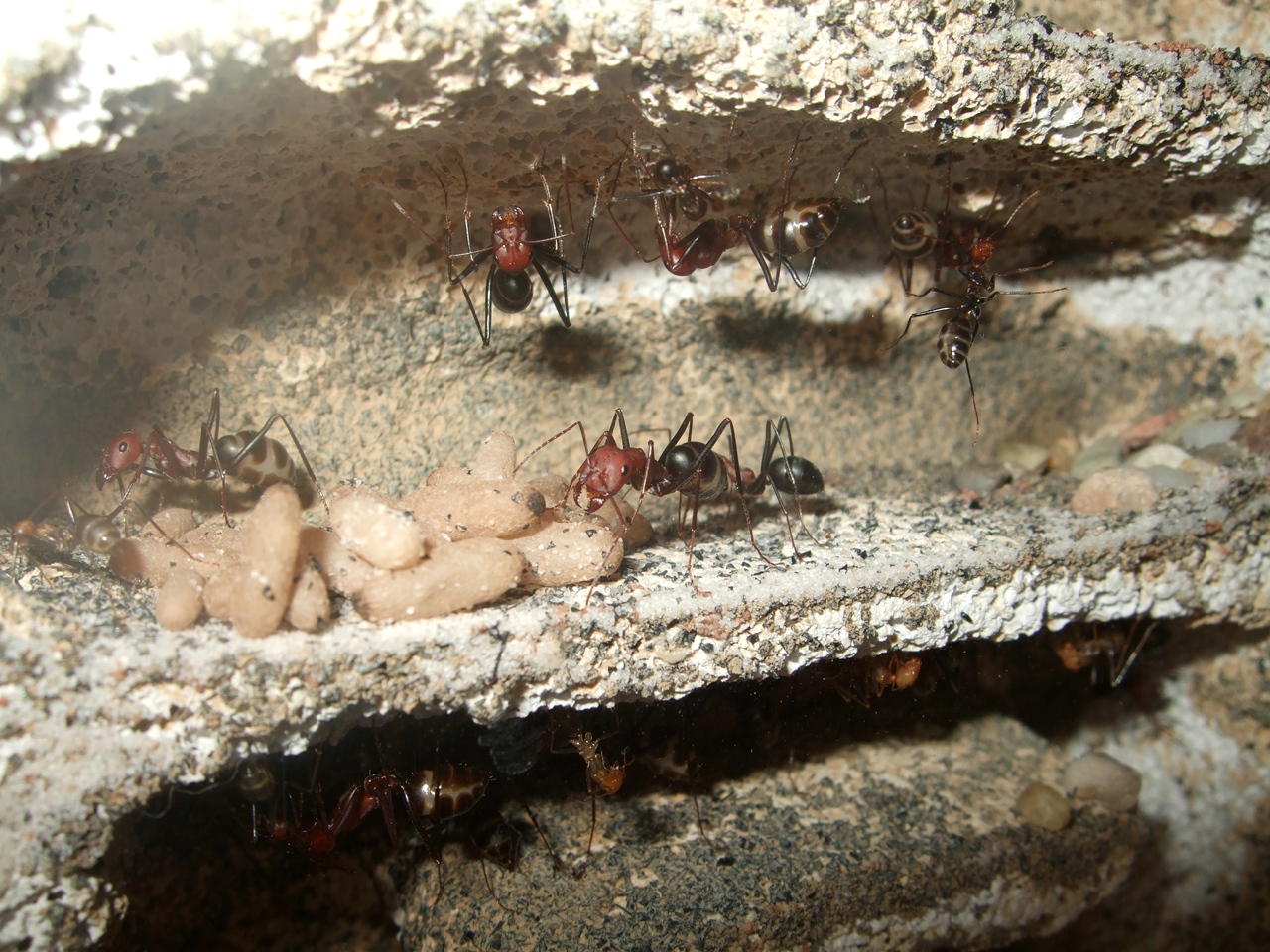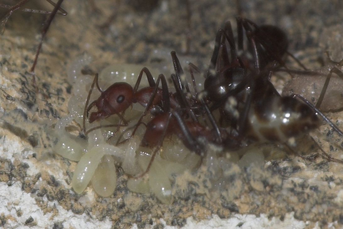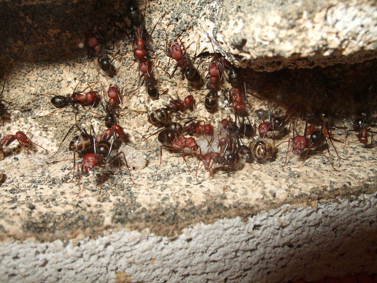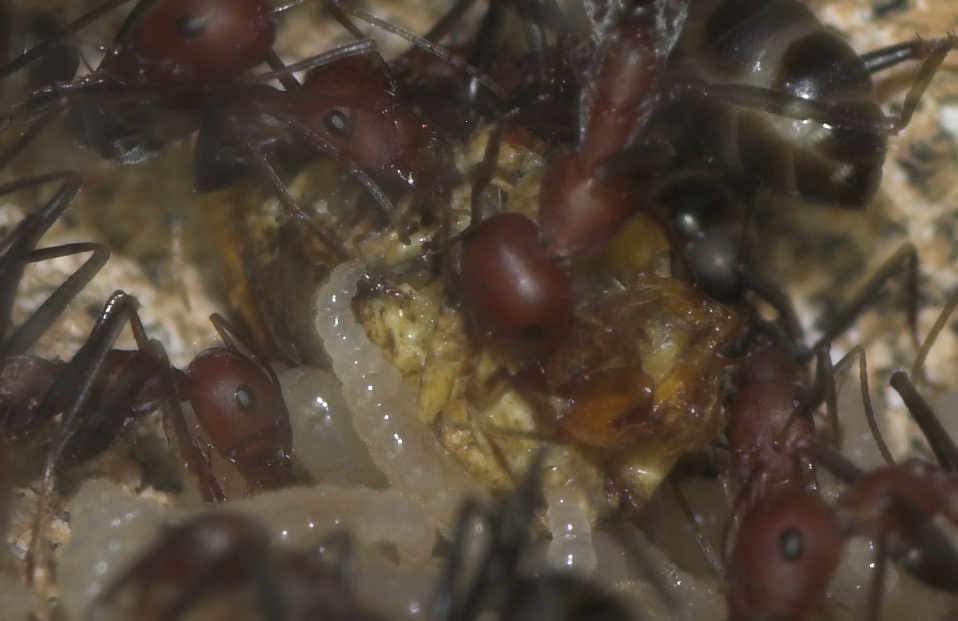 Sehr aggresive Tiere, auch untereinander. Regelmäßiges an stubsen anderer Arbeiterinnen. Transportieren sich regelmäßig ins Nest dabei auch nicht zimperlich. Können mich sehen wenn ich vor dem Becken sitze, reagieren dann auf meine Bewegungen sehr aggressiv und wollen mich attackieren! Bei der Jagd sind sie sehr vorsichtig und greifen ihr opfer immer wieder an um dann blitzschnell wieder davon ab zulassen, dann wird die Beute umgehend ins Nest gebracht!