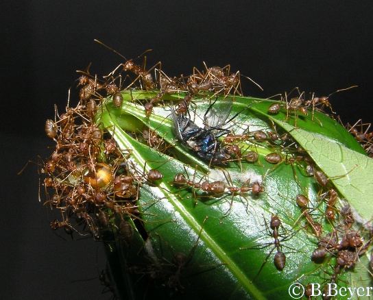 Mit beeindruckender Geschwindigkeit ging es vorwärts, einzelne Blätter waren bereits nach einigen Stunden zusammengebracht und so rückten die ersten Arbeiterinnen-Kolonnen mit Larven an. Ein nächster erstaunlicher Punkt bei dieser Art: Normalerweise würden sich die Larven in einen Kokon einwickeln, in dem sie die Metamorphose zum adulten Insekt vollziehen. Bei den Weberameisen spielt dieses Entwicklungsstadium jedoch eine entscheidende Rolle beim Nestbau. Sie spenden den "Klebstoff", um die Blätter ihrer zukünftigen Behausung zu verbinden. Die Larven werden zwischen den Mandibeln gehalten und mit den Antennen betrillert, welches sie veranlasst ihr seidiges Sekret abzugeben. Mit seitlichen Bewegungen zwischen den Blatträndern hin und her wird das Nest nun verwoben und erhält seine Stabilität. Doch in der Natur geschieht nichts aus reiner Selbstlosigkeit, denn in diesem Nest werden auch die Larven einen Platz finden, der ihnen Sicherheit bietet und wo sie versorgt werden.