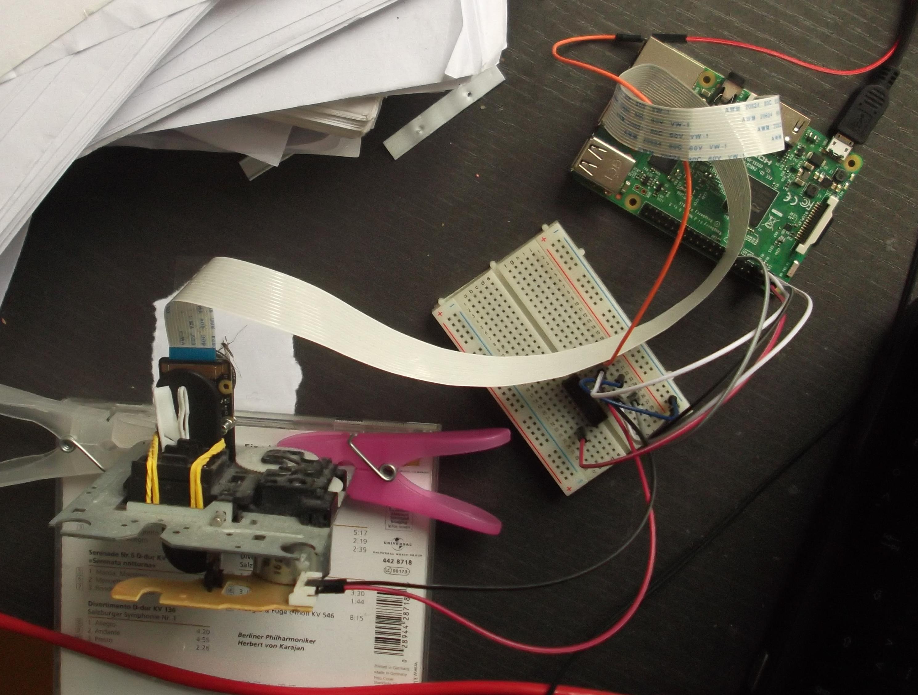 Da mein optisches System einen fixen Fokus hat, muà ich den Abstand von Objekt zu Objektiv verÀndern, um die Fokusebene zu verschieben. Zu diesem Zwecke, da es von Hand eine grauenhafte Arbeit wÀre, habe ich die Kamera auf ein altes CD-ROM-Laufwerk montiert, dessen Motor ich mit einem Raspberry Pi steuere, um die Fokusebene zu justieren.
