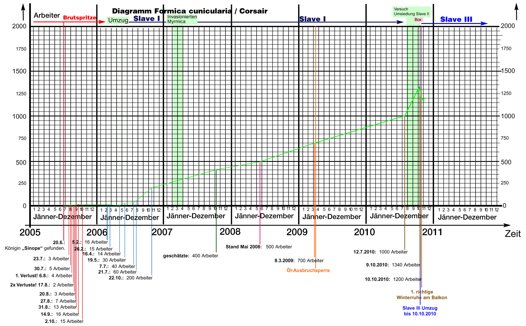 13.03.2011 Aufgrund der letzten warmen Tage und der noch folgenden warmen Tage dieWinterruhe abgebrochen. Hab sie wieder zu mir nach Hause geholt und das Formikarium vom gebildeten Schimmel und dem Haufen an Arbeiterinnen-Leichen befreit und alle Scheiben und Innenteile gereinigt. Nach ersten mehrmaligen Zählungen bestand der Leichenhaufen aus 365 Arbeiterinnen die dort tot und schimmelnd aufgetürmt wurden. Doch der großteil der Arbeiterinnen ist mit der Königin die schon munter im Nest umher ging wohl auf. Heute noch die Arena mit Schlauch an das Formikarium angedockt in der ich ihnen Honigwasser und BCE-Vitaminsaft anbiete.