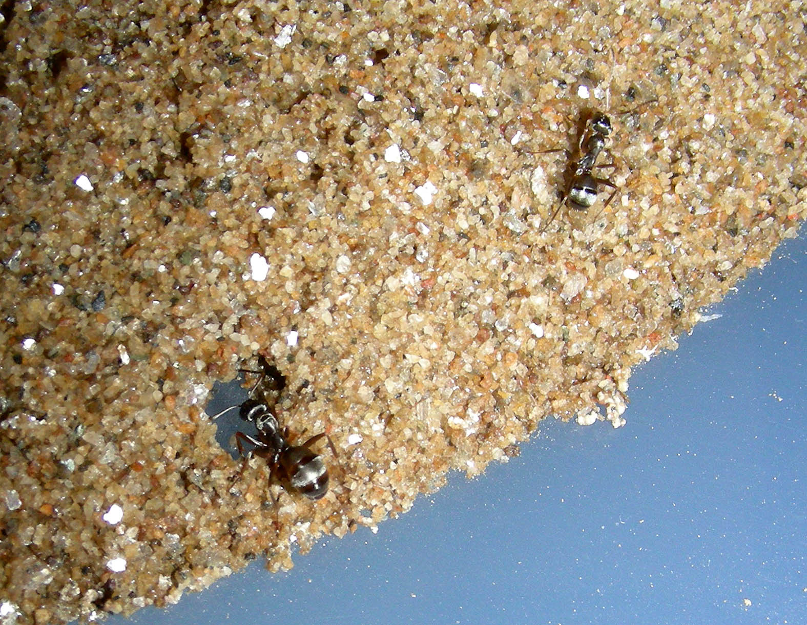 19.03.2011 Die Arbeiter bauen immer noch weiter im Arenasand nachdem ich diesen vor ein paar Tagen befeuchtet habe. Auch haben sie Sand runter in Formikarium getragen aber diesen nur unten auf die Aluschiene gelegt - die ist ihnen wohl zu kalt. Honigwasser wird auch weiter brav aufgenommen und ins Formikarium transportiert oder fleißige Arbeiterinnen damit gefüttert.