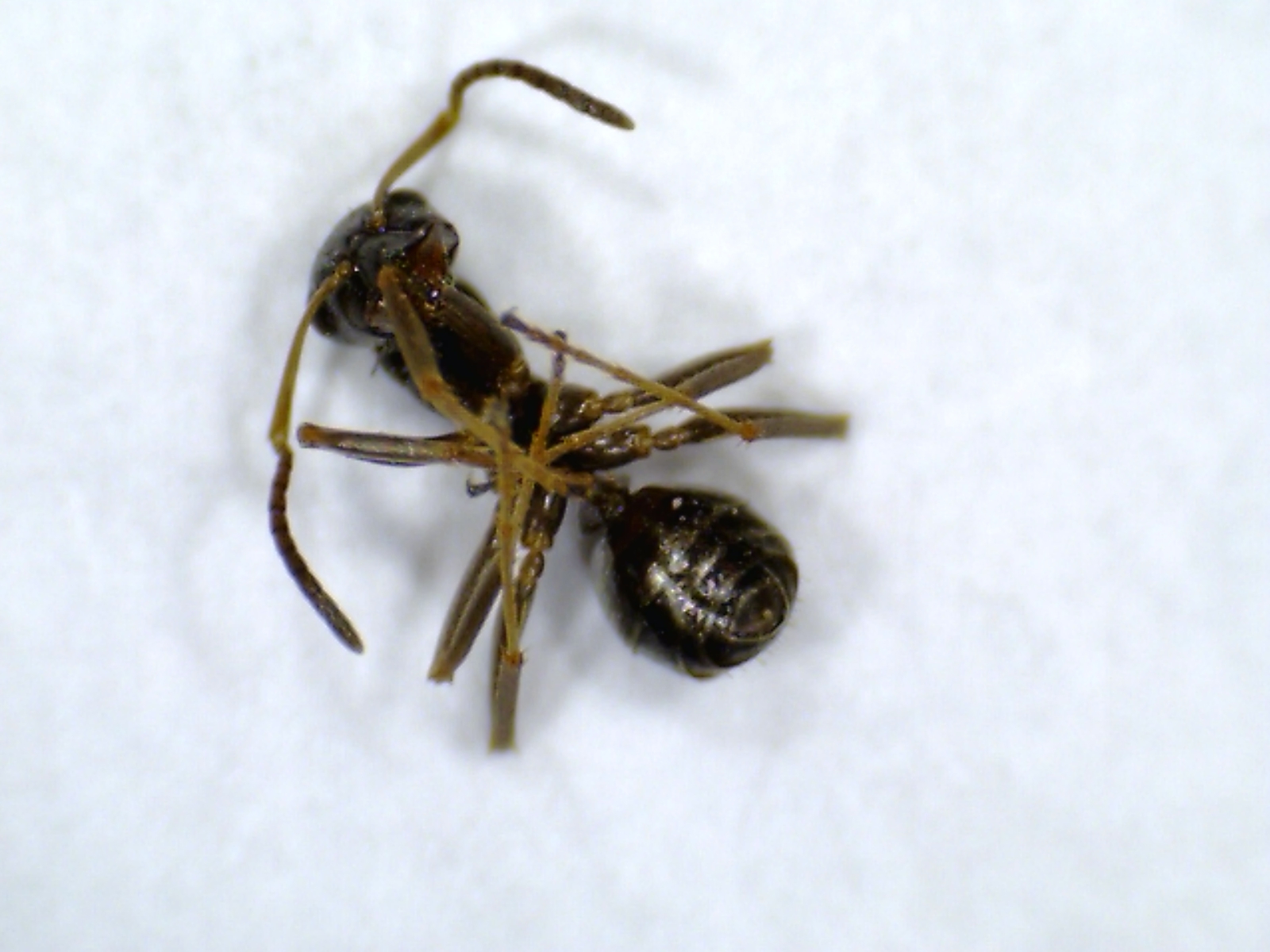 Noch immer weiß ich nicht was genau die Arbeiterinnen sterben lässt, aber meine Vermutung geht immer mehr in Richtung Bandwürmer, Cestoda. Die Gaster sind extrem dick, obwohl ich seid Wochen keine Nahrungsaufnahme sehen konnte. Und manche Arbeiterinnen sind nicht richtig schwarz geworden. Sie sind noch sehr hell, fast noch weiß. Gesehen habe ich aber noch keinen Bandwurm, obwohl ich die toten unter dem Mikroskop aufgeschnitten habe. Diejenigen die sterben, haben allerdings auch keine extrem dicken Gaster mehr. Ich kann aber auch leider nicht beurteilen, ob sie vorher extrem dicke Gaster hatten.