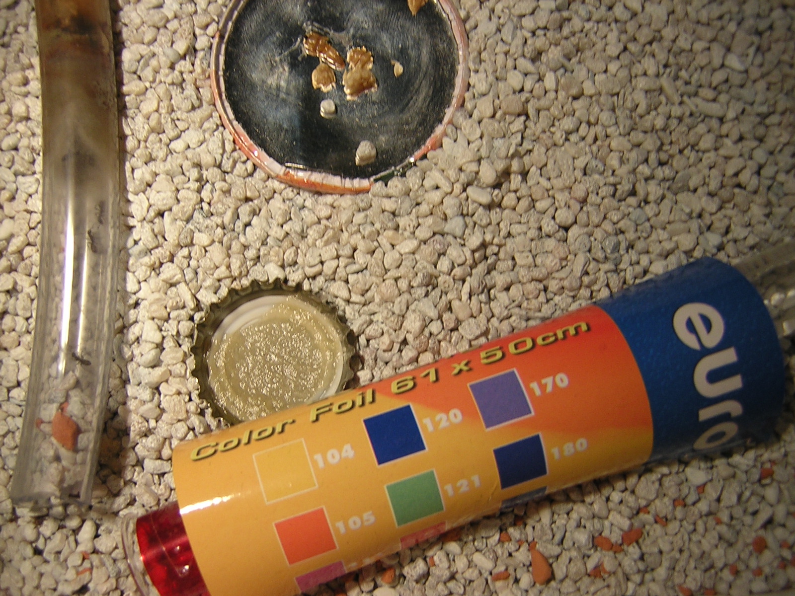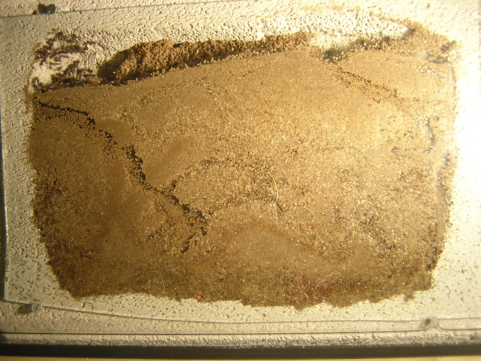 Zu allem Überfluss habe ich, wahrscheinlich mit meinem Unterarm, noch eine Schneise durch meine Ausbruchssicherung(Talkum) gezogen als ich in der Arena herumgefingert habe und dies erst am nächsten Tag bemerkt. Dabei sind ein paar Ameisen ausgebrochen, wenn ich mich nicht verzählt habe, 4 oder 5.