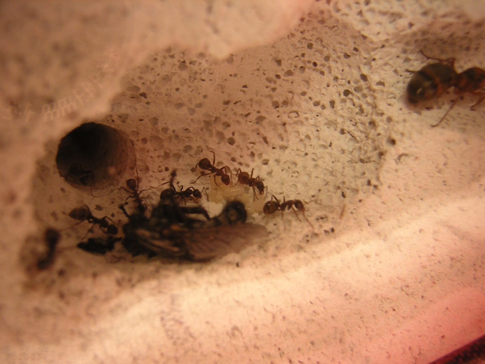 Seit die Kolonie in ihrem neuen Heim ist, ist die Aktivität auch bei eingeschalteter Lampe zurückgegangen. Maximal 1-3 Arbeiterinnen furagieren außerhalb des Nestes, diese aber mit einem enormen Tempo, die Arbeiterinnen rennen regelrecht Kreuz und Quer durch das Formicarium, lediglich am Honig und am Mehlwurm machen sie kurz halt, scheinen dann etwas von der aufgenommenen Nahrung ins Nest zu bringen und beginnen das Spiel anschließend von neuem.