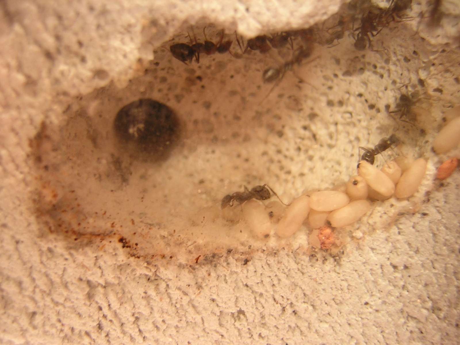 Ursprünglich war geplant den Ytong bei Bedarf zu bewässern, warum ich es bislang trotzdem nicht getan habe liegt schlicht daran, dass sich die Kolonie in dem staubtrockenem Ytong bei 30° und einer LF von 30% und weniger pudelwohl zu fühlen scheint, wohingegen im RG-Nest, in dem zweifellos eine höhere LF herrscht und das zur Zeit die einzige Wasserquelle darstellt, sich lediglich eins bis zwei Arbeiterinnen dauerhaft aufhalten(möglicherweise noch die Eier).
